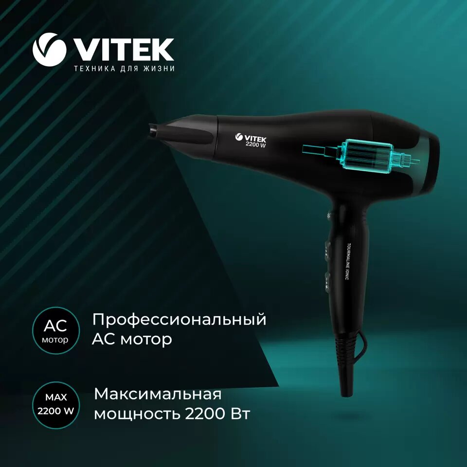 Фен VITEK VT-8215, 2200Вт, ионизация, холодный воздух, черный интересное: