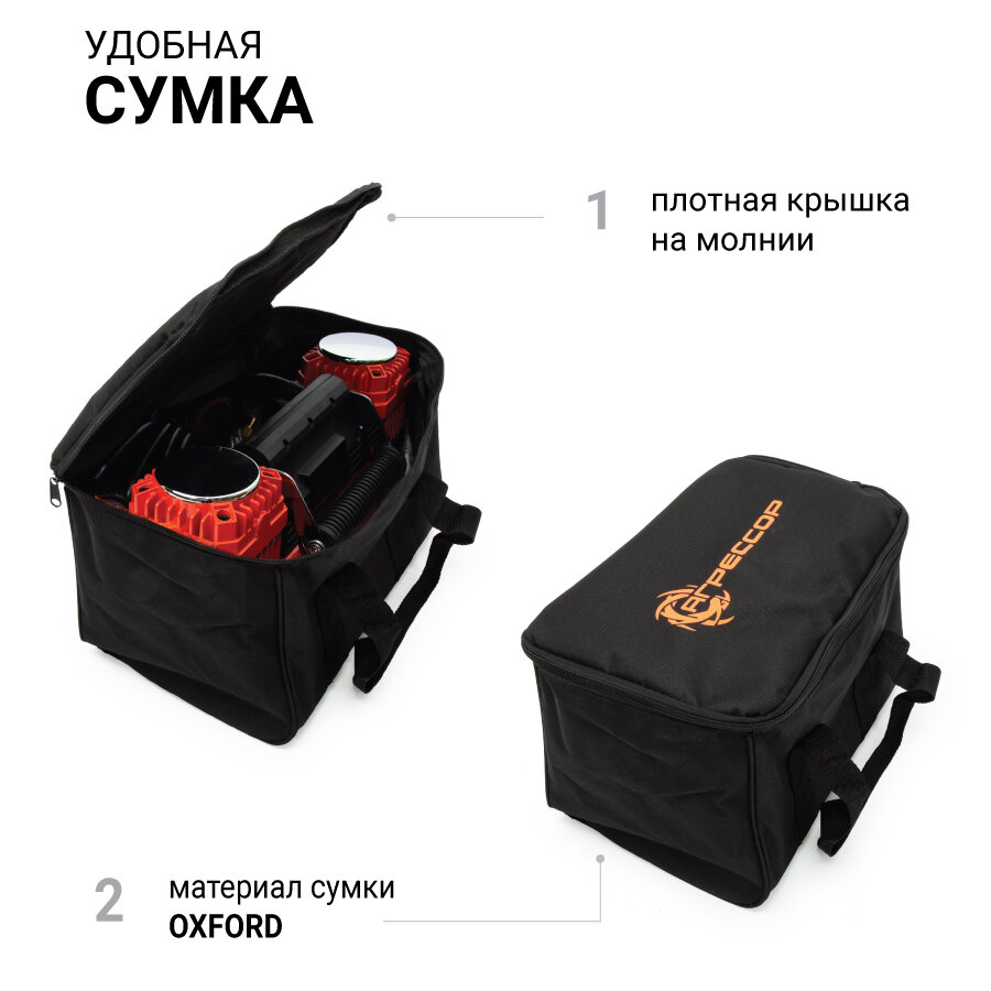Компрессор автомобильный CityUP двухпоршневой с фонарем, 60л/мин, 300 Ватт, сумка в комплекте + переходник для АКБ