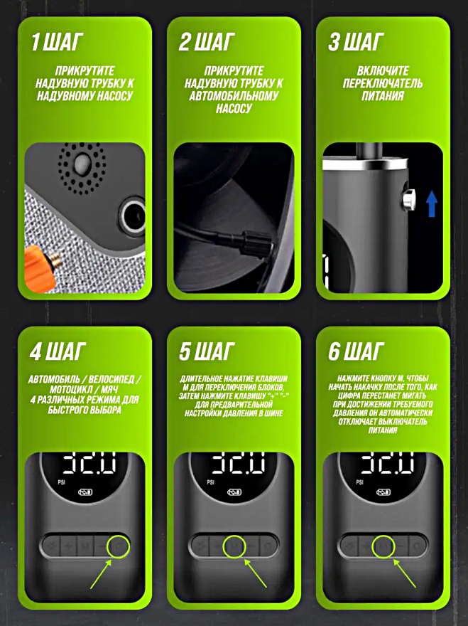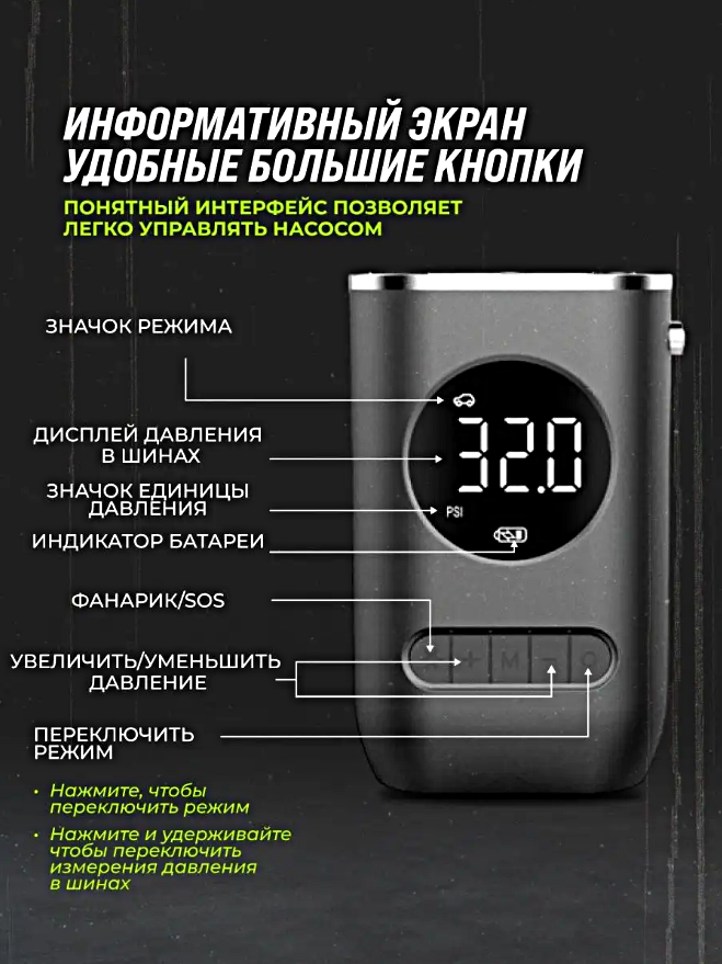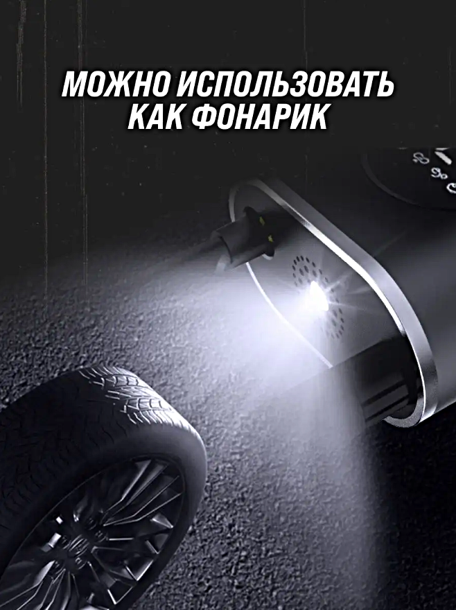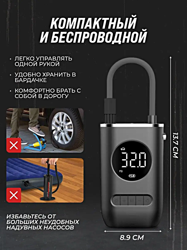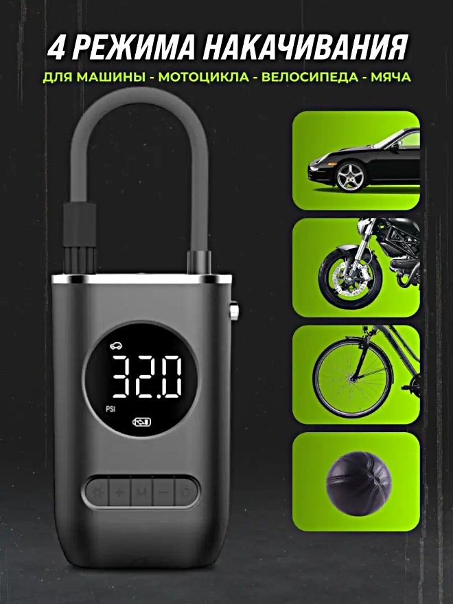 Компрессор беспроводной, Портативный насос универсальный для машины, мотоцикла, велосипеда, мяча, LED дисплей, Черный интересное:
