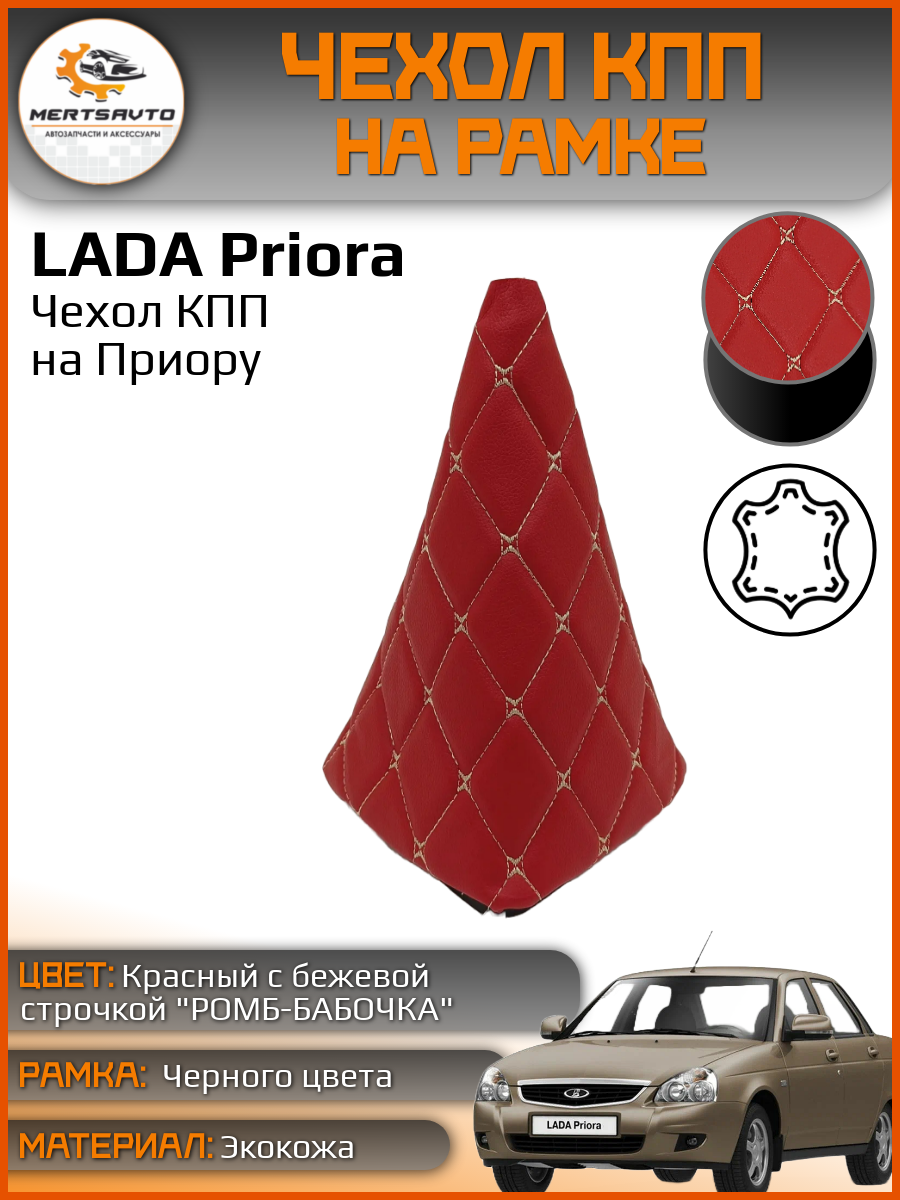 Купить Чехол коробки переключения передач (КПП) на ВАЗ-2170 Лада Приора (Lada Priora) красный с бежевой строчкой "ромб-бабочка"