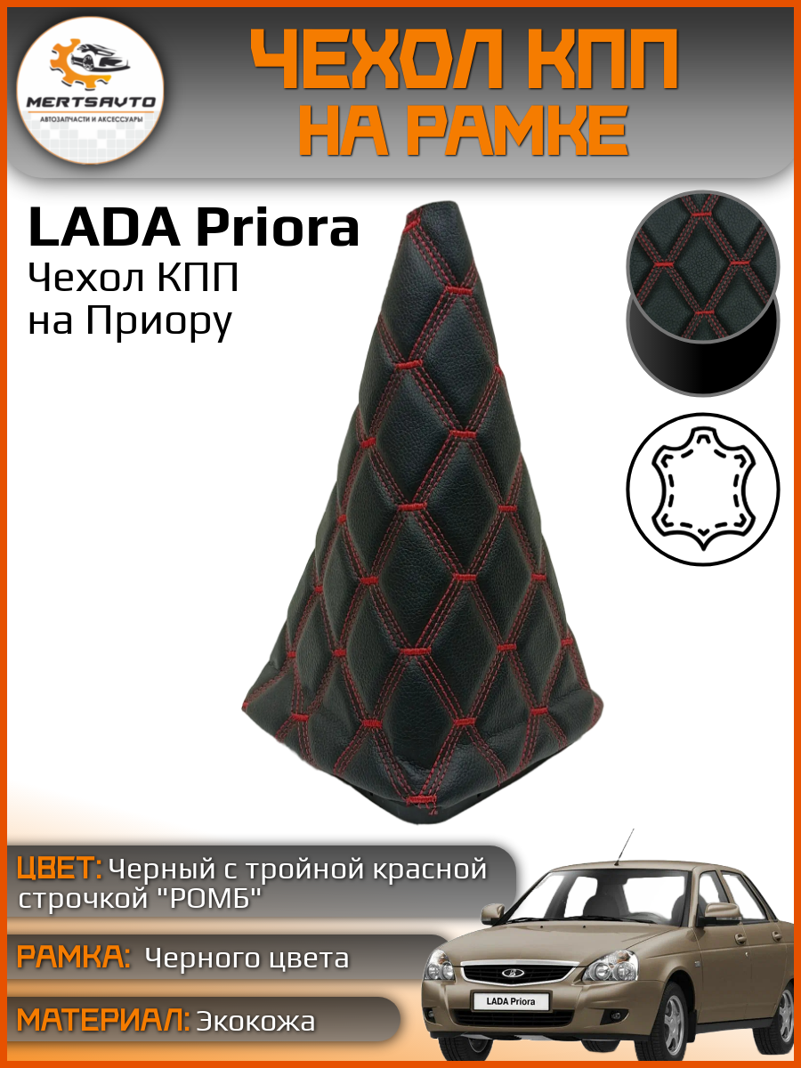 Купить Чехол коробки переключения передач (КПП) на ВАЗ-2170 Лада Приора (Lada Priora) черный с тройной красной строчкой "ромб"