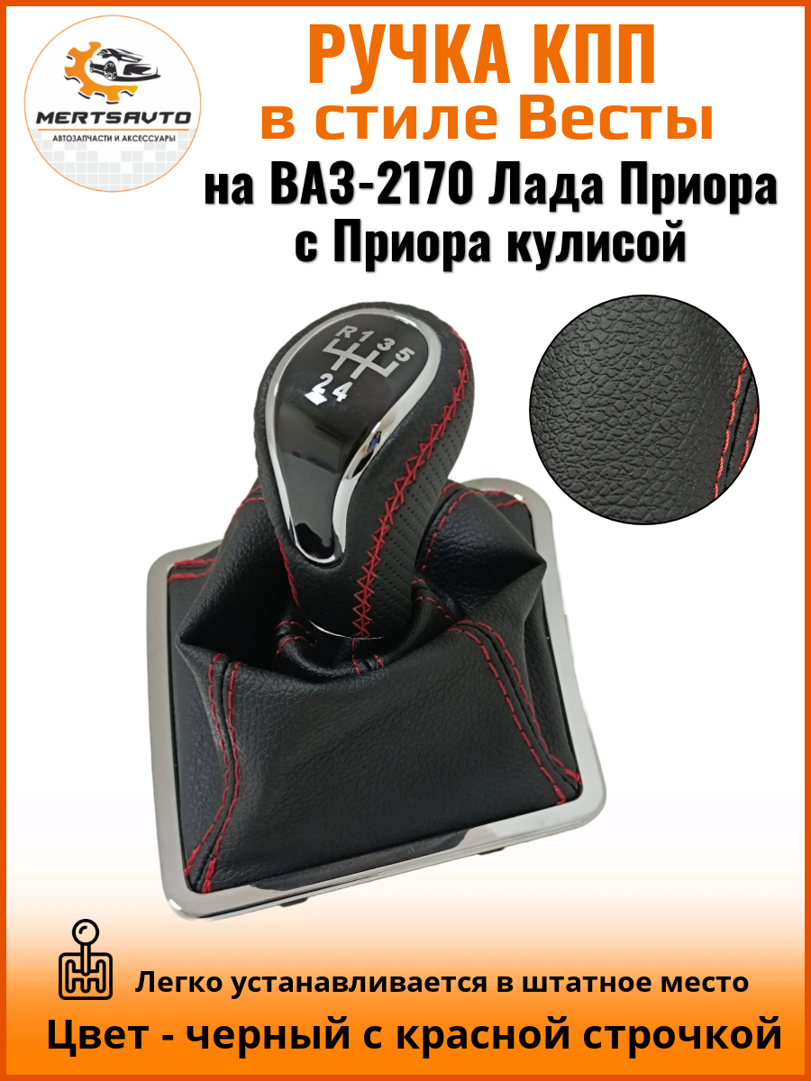 Ручка КПП с чехлом в стиле Весты на ВАЗ-2170 Лада Приора 1 с Приора кулисой, черный с красной строчкой "рамка лак"
