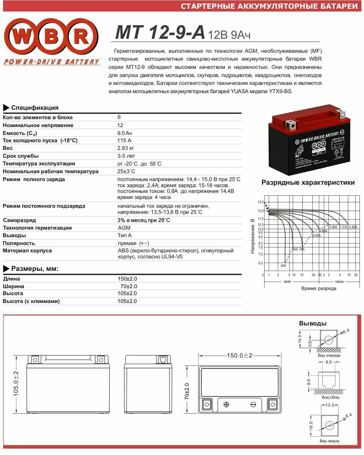 СохранитьМото аккумулятор стартерный WBR MT12-9-A 12В 9Ач (12V 9Ah) полярность прямая 115A (YT9B-BS, CT 1209) AGM аккумулятор для мотоцикла, скутера, квадроцикла, снегохода, дизельных генераторов SMT12-9-A интересное: