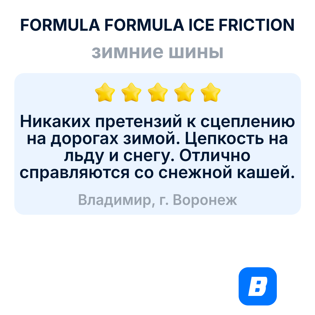 | Отзыв: | Резина так себе. Раньше ездил всегда только на топовых европейцах, но столкнулся с тем , что нормальных колес не купить, даже при наличии денег!) и так, что имеем: Мишлен/Конти/Бриджи позопрошлых годов выпуска и по оверпрйсу; Хакка - отзывы по ней убили и невооружённым глазом стало ясно, что с уходом финов … без комментариев. И пирелли мэйд ин раша, в моем размере была только Формула айс фр. Стоит сказать, что последние лет 5 на всех трех машинах ездил на топовых Пирелли зимой и это была песня. Уже по цене понял, что ждать чуда не стоит, плюс все продавцы твердили про «второй эшелон». Но когда я выехал на трассу, то сразу вспомнил это забытое чувство из молодости - когда у тебя плохая резина! Относительно нормально можно ехать только по укатанному снегу, но на асфальте - это провал! Пробовал ее от 0 до -22 градусов на асфальте с реагентами/кашецой/ водой - во всех режимах снос в поворотах + выкидывание из колеи даже при движении по прямой! Ехать просто опасно. Единственное - она подойдет для жителей крупных городов, где чистят дороги и где в силу траффика не ращгонишься больше 60. Если у вас более-менее серьёзной быстрый авто и вы часто передвигаетесь по трассам (кад/мкад/зсд)- не вздумайте ЭТО брать , это уровень Китая. Слава богу есть кроссовер , на котором стоят старые пирелли сделанные где надо и на них я спокойно прохожу на 100 км/ч места, где на Формуле кое-как на 60.