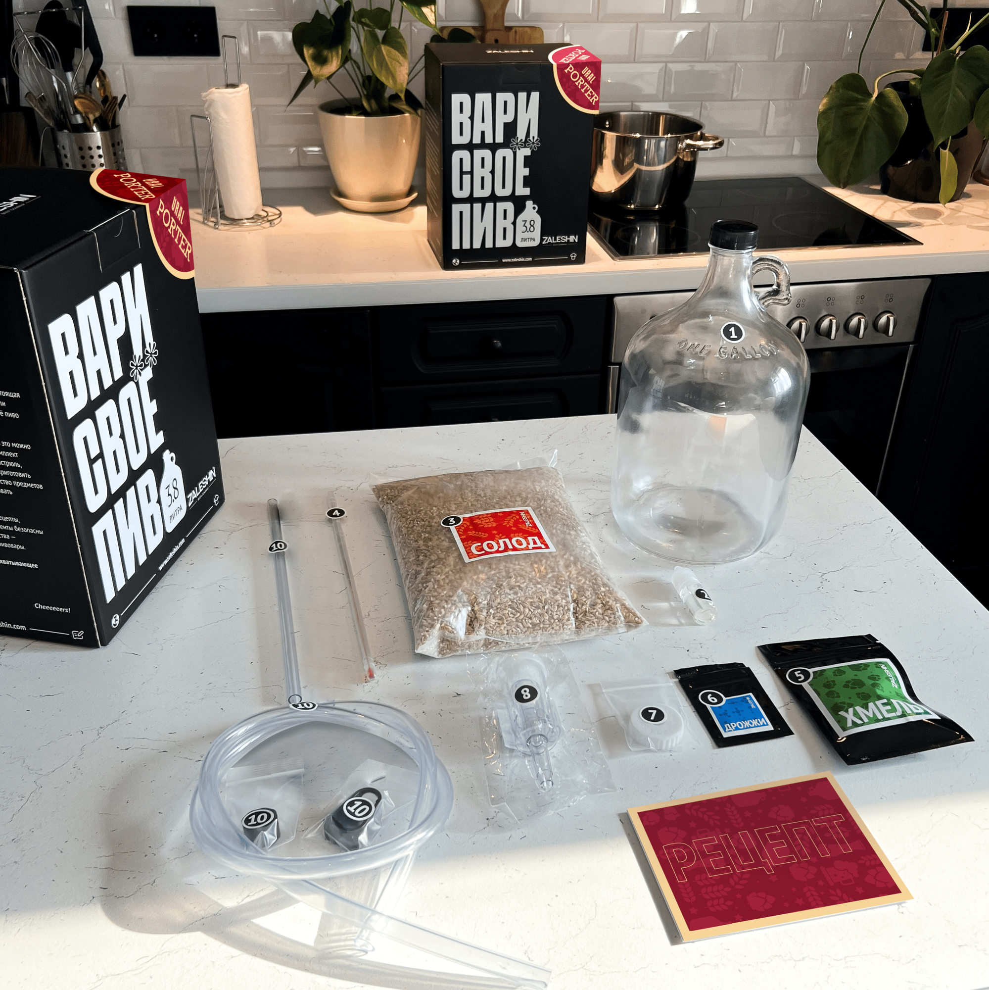 | Дополнительная информация | Кувшин стеклянный 1 галлон (1 шт. ), дезинфектор (10 мг.), солод (750 гр.), хмель (6 гр.), дрожжи пивные (1 гр.), термометр спиртовой (1 шт.), пробка (1 шт.), гидрозатвор (1 шт.), сифон для перелива (1 шт.) |