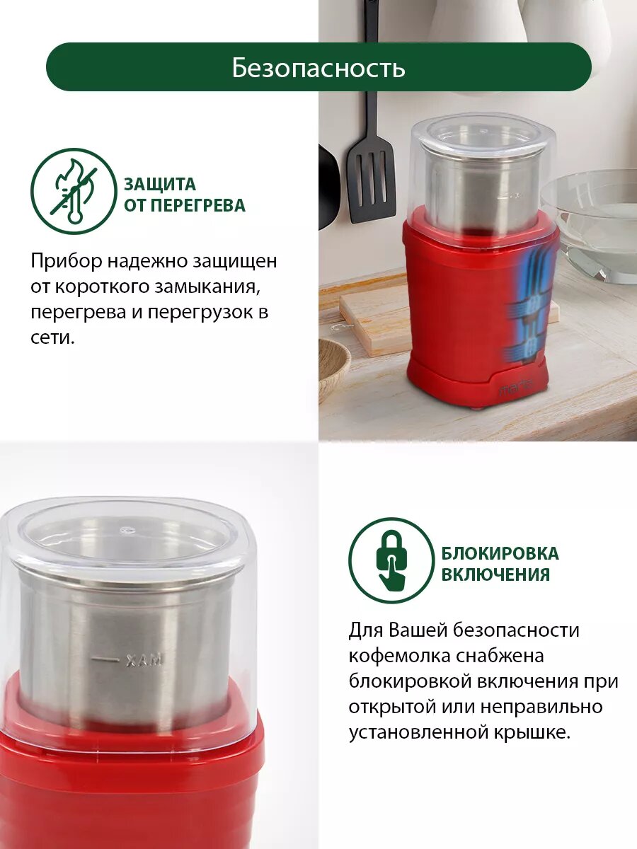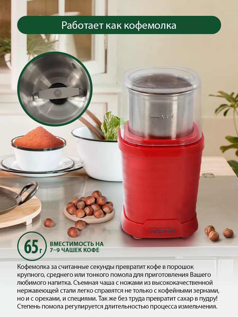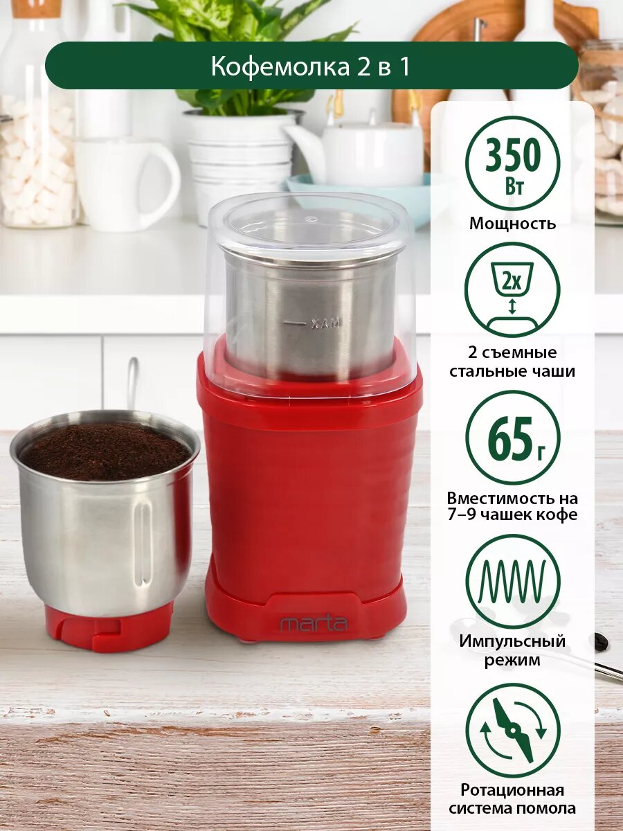 Кофемолка MARTA MT-CG2182B 2 съемные чаши красный рубин интересное: