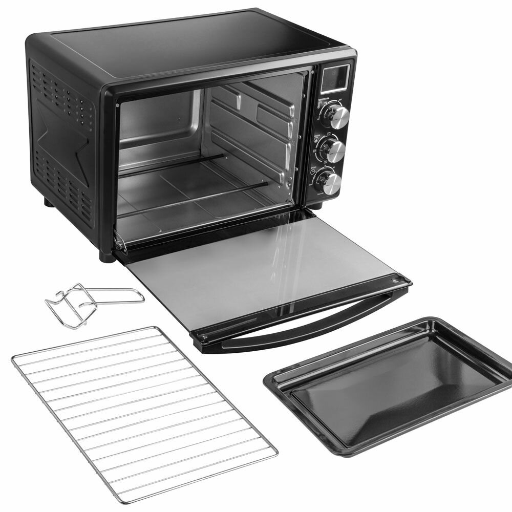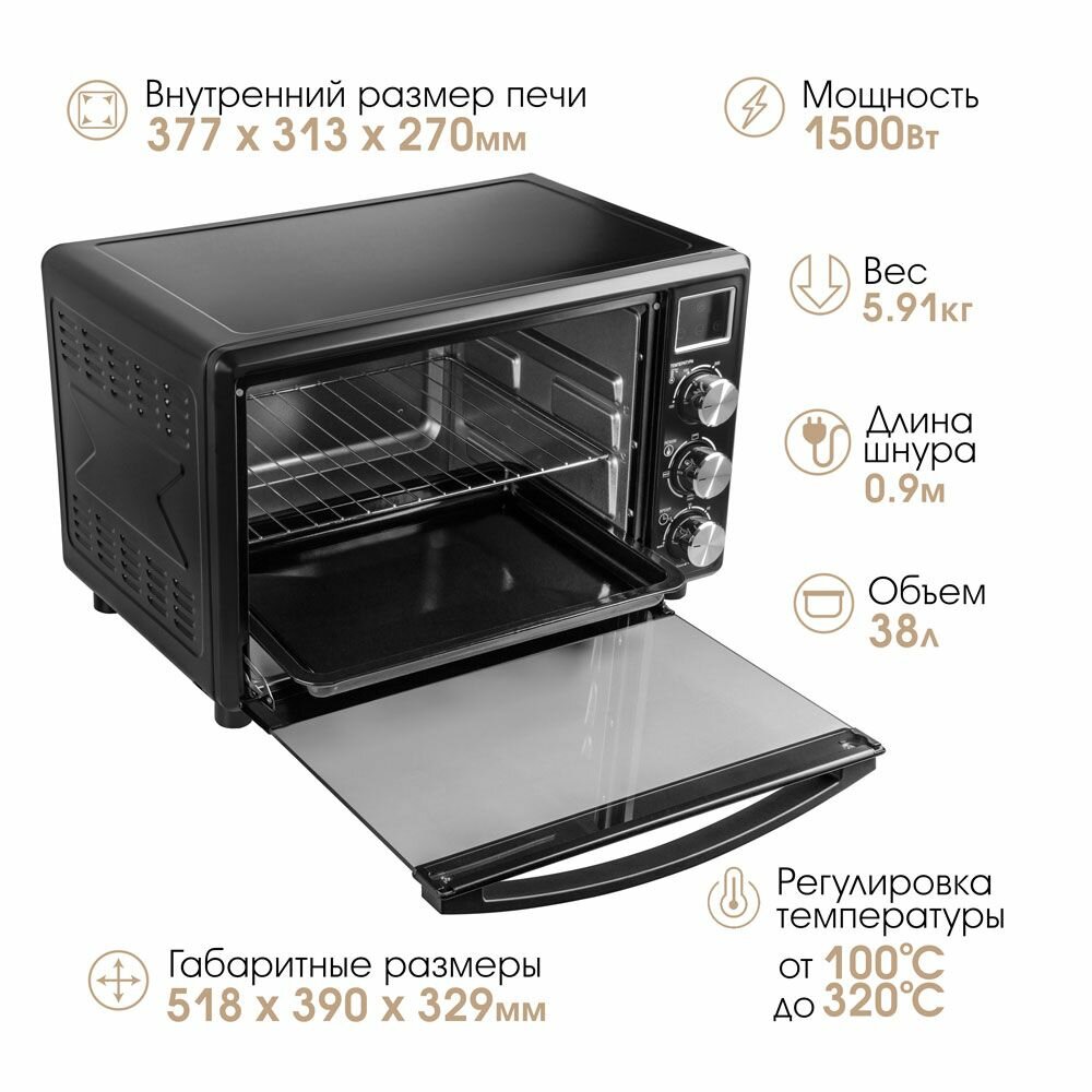 размер противня 37.5*27.3*2.6 см; размер решетки 37.5*27*0.5 см; нагревательные элементы из нержавеющей стали, большая дверца и удобная ненагревающаяся ручка, таймер с функцией автоотключения и звуковым сигналом, количество противней в комплекте: 1.