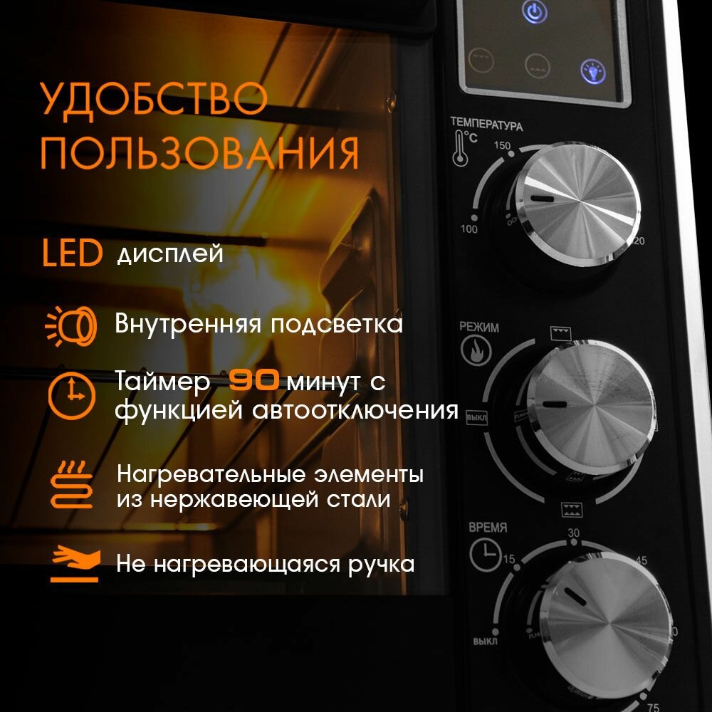 Достойно выполняет свои функции, запечь мясо для неё не проблема, объём хороший. Морока недостатков вычислено не было. Подсветка внутри есть - лампочка на боковой стенке (светит всё время и выключается только тогда, когда выключается сама печка). Таймер, точнее его длительность, вообще заслуживает отдельной похвалы, чаще всего встречаются таймеры на 1 час, а у этой полтора и для меня это серьёзный плюс. Температура нарастает быстро, прокручиваю поворотный регулятор температуры до предела, ставлю двойной режим нагрева (верх-низ) и через несколько секунд она уже начинает становиться всё теплее и теплее, а через минуту засунуть внутрь руку уже больно. Наперёд загадывать не буду, но пока печка меня радует.