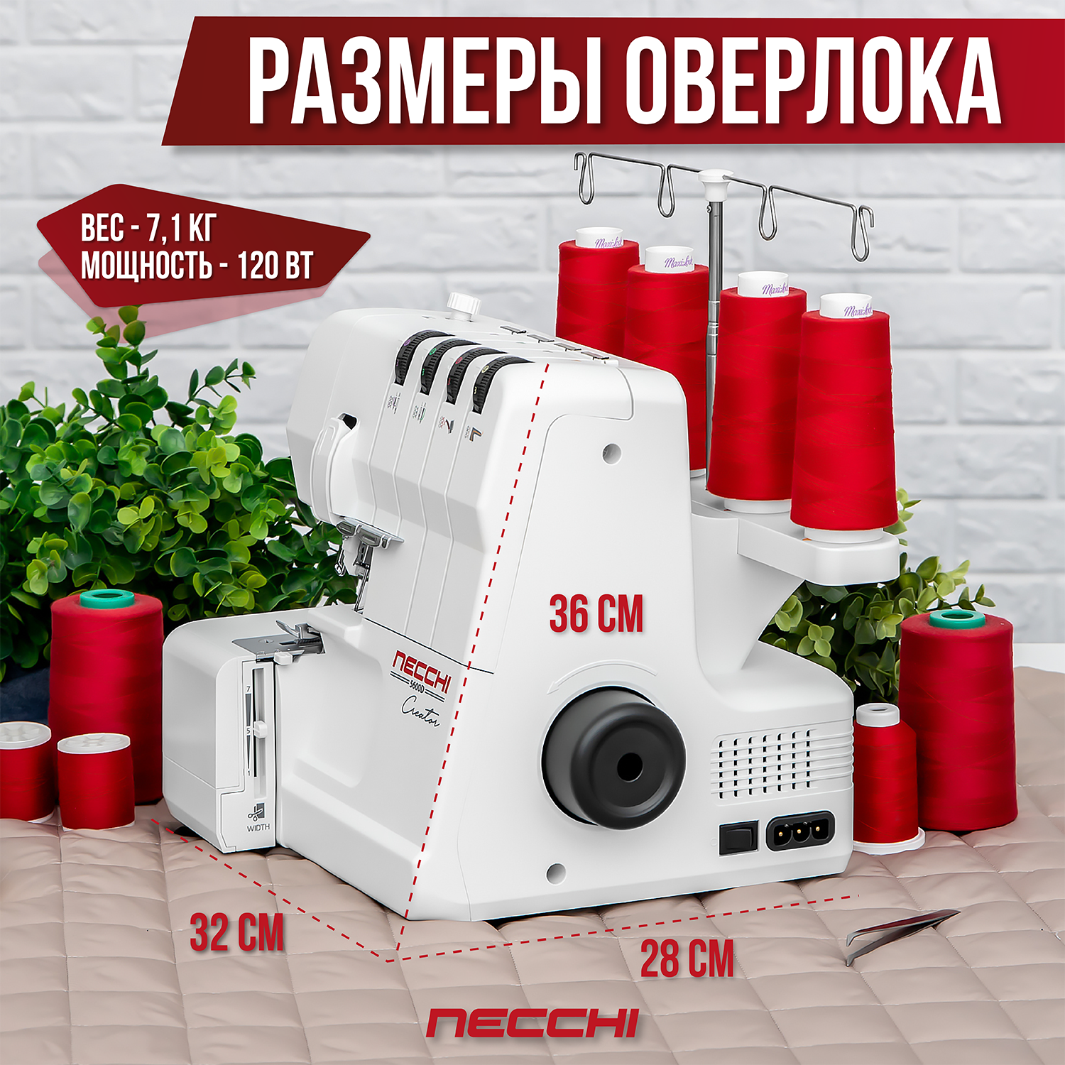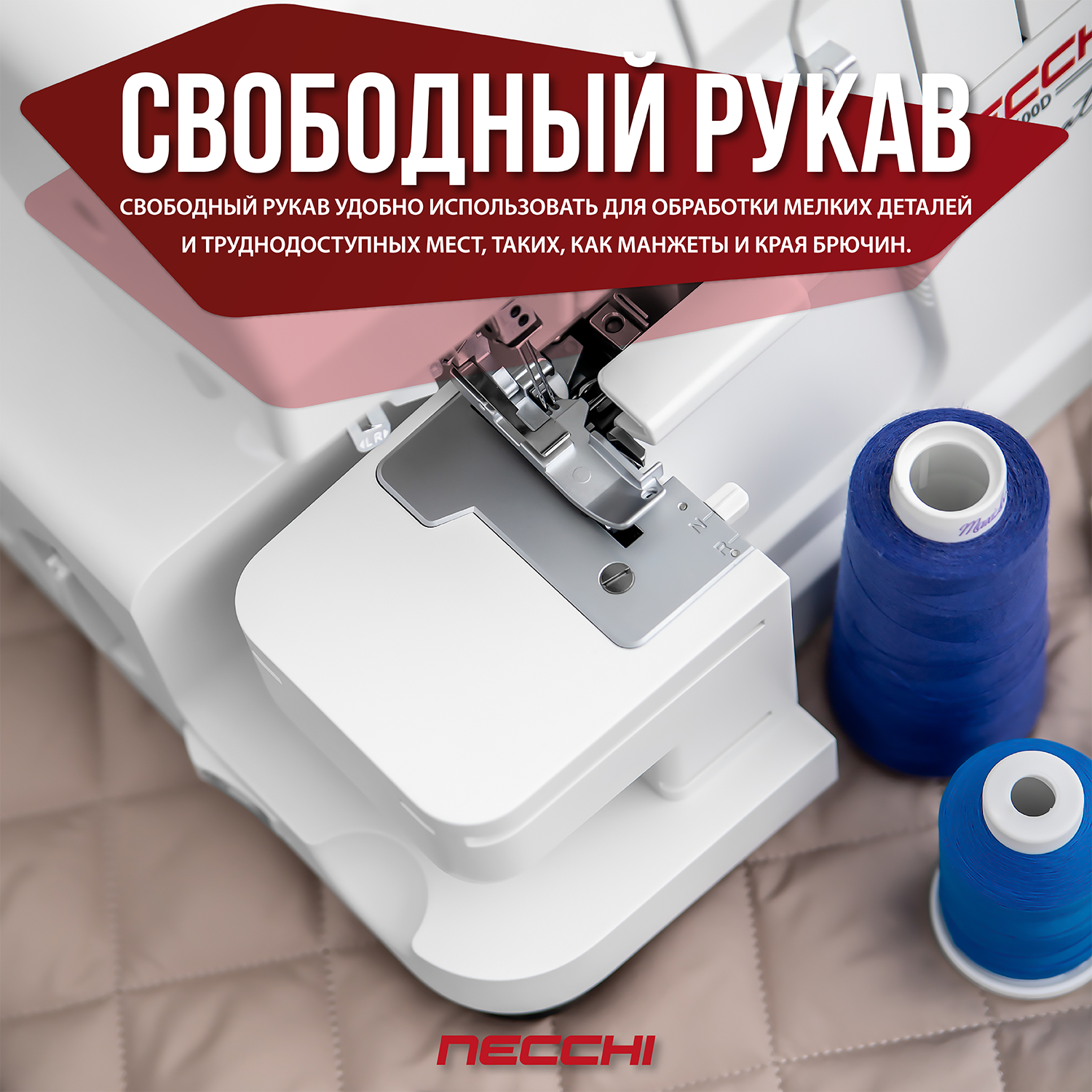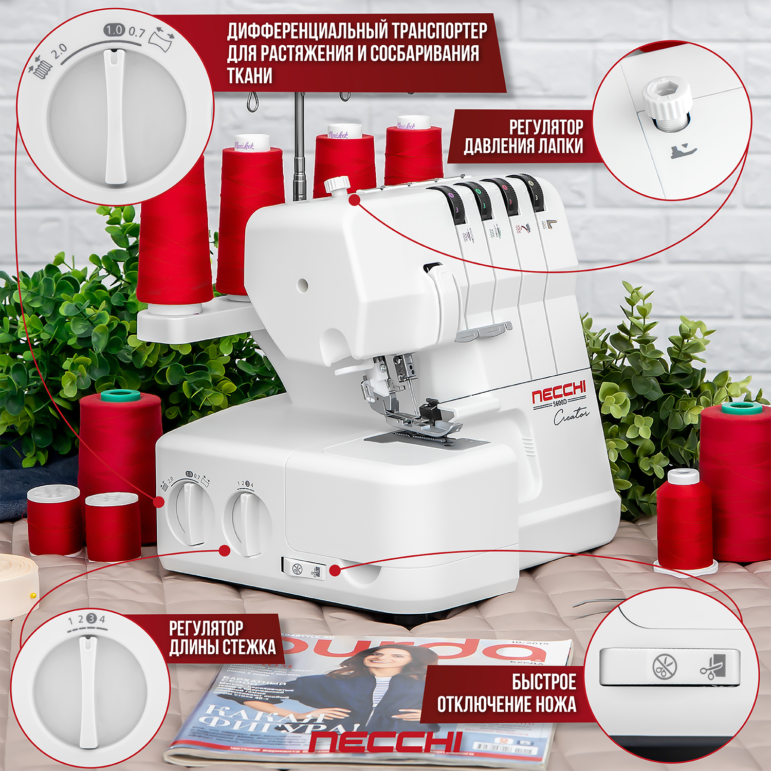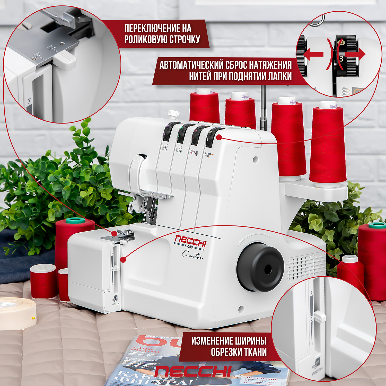 Оверлок Necchi 5600D, 2,3,4-х ниточный, съемная рукавная платформа, нитевдеватель, регулятор давления на лапку. интересное: