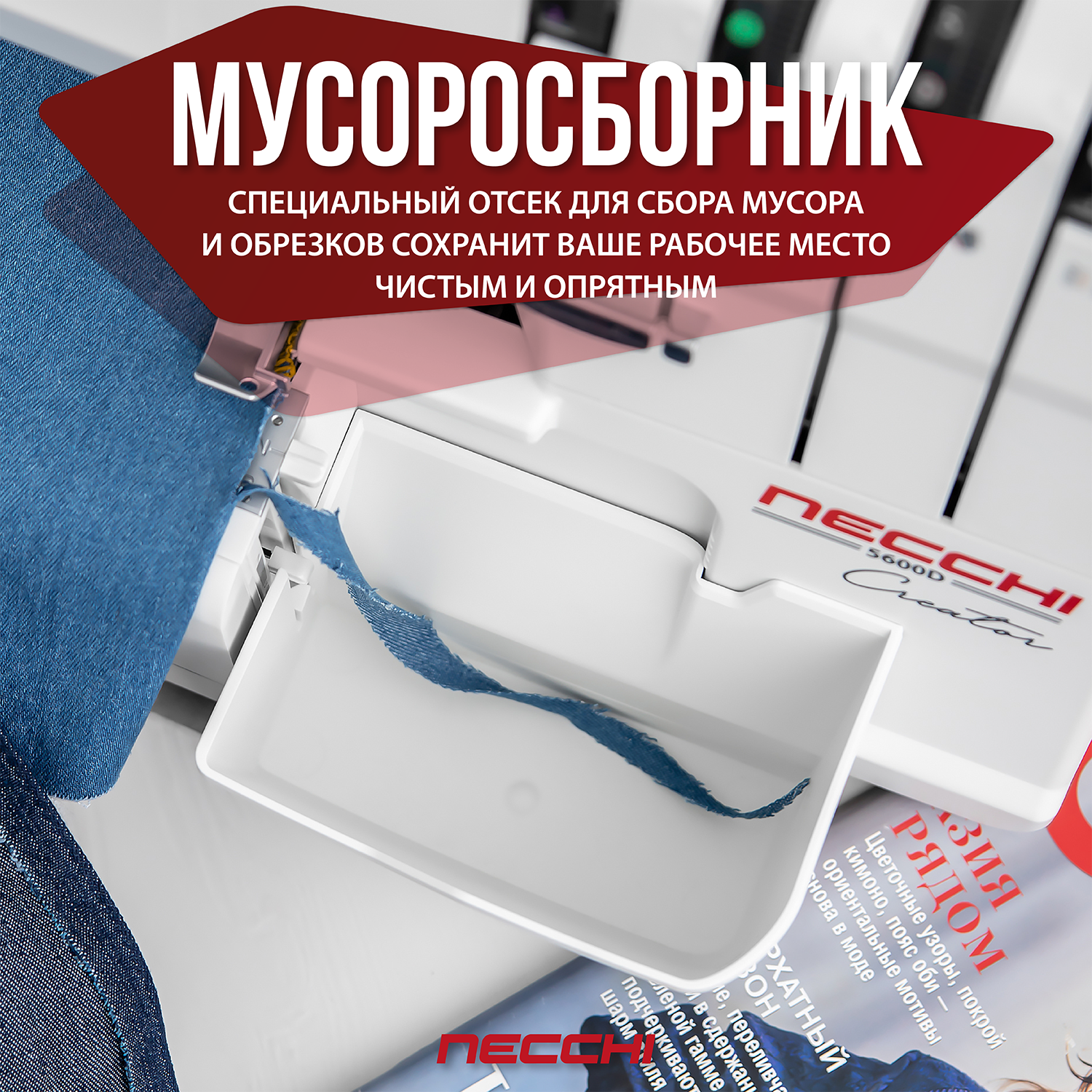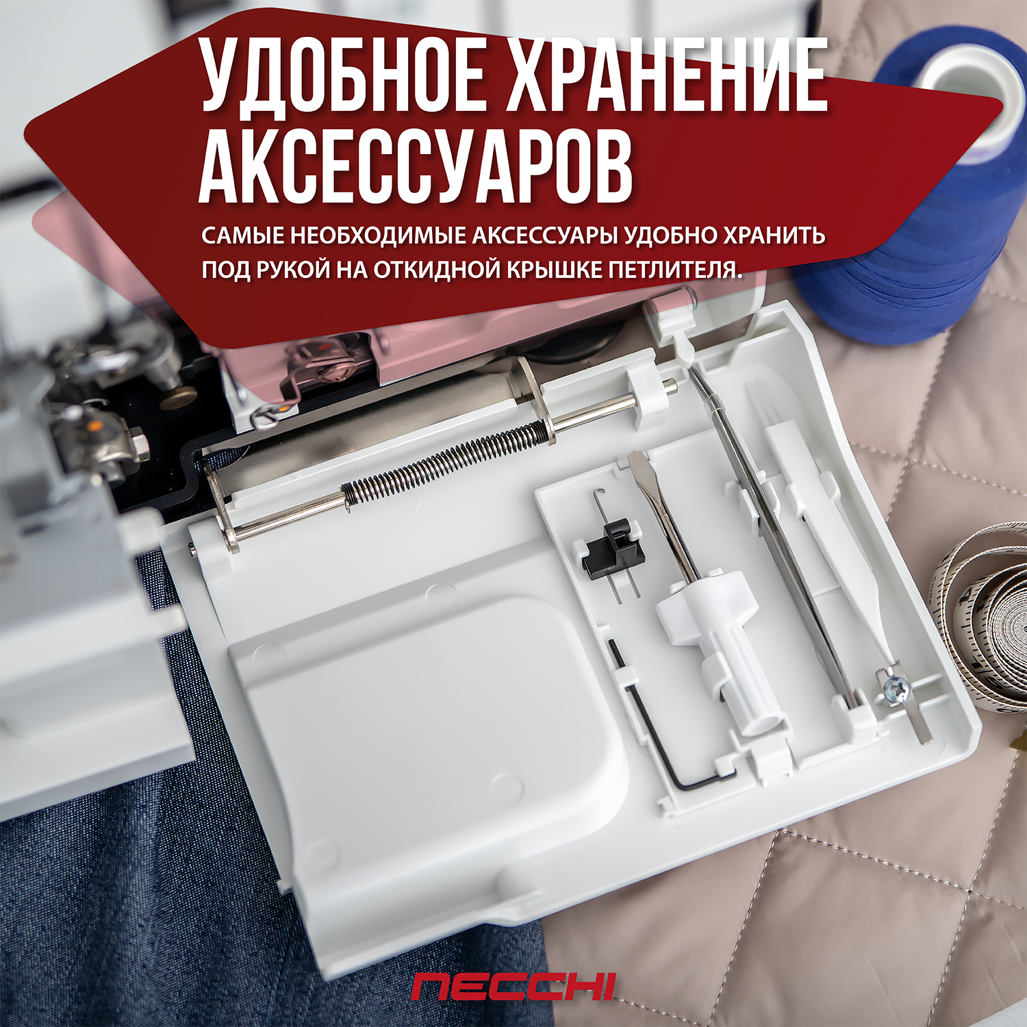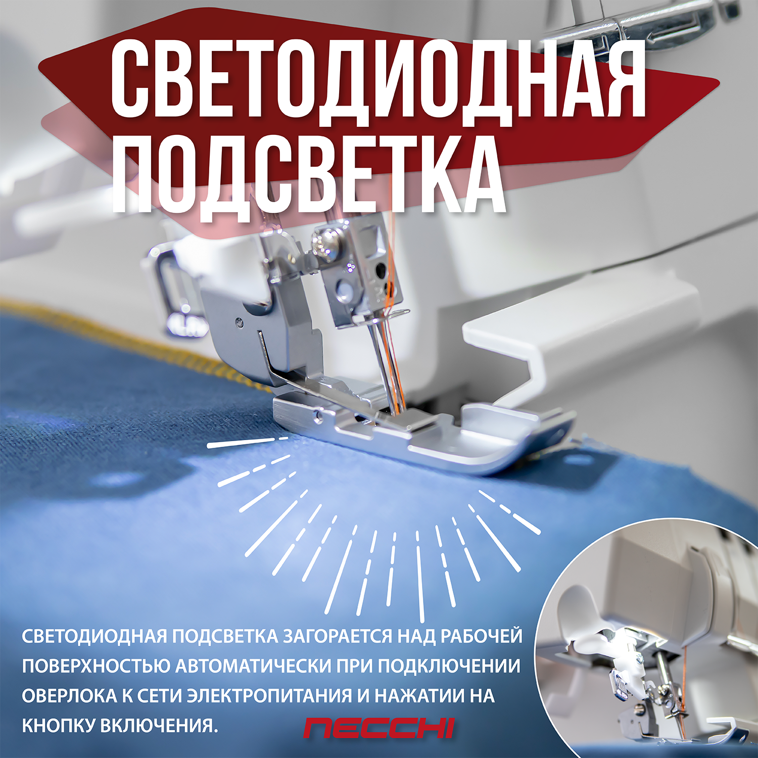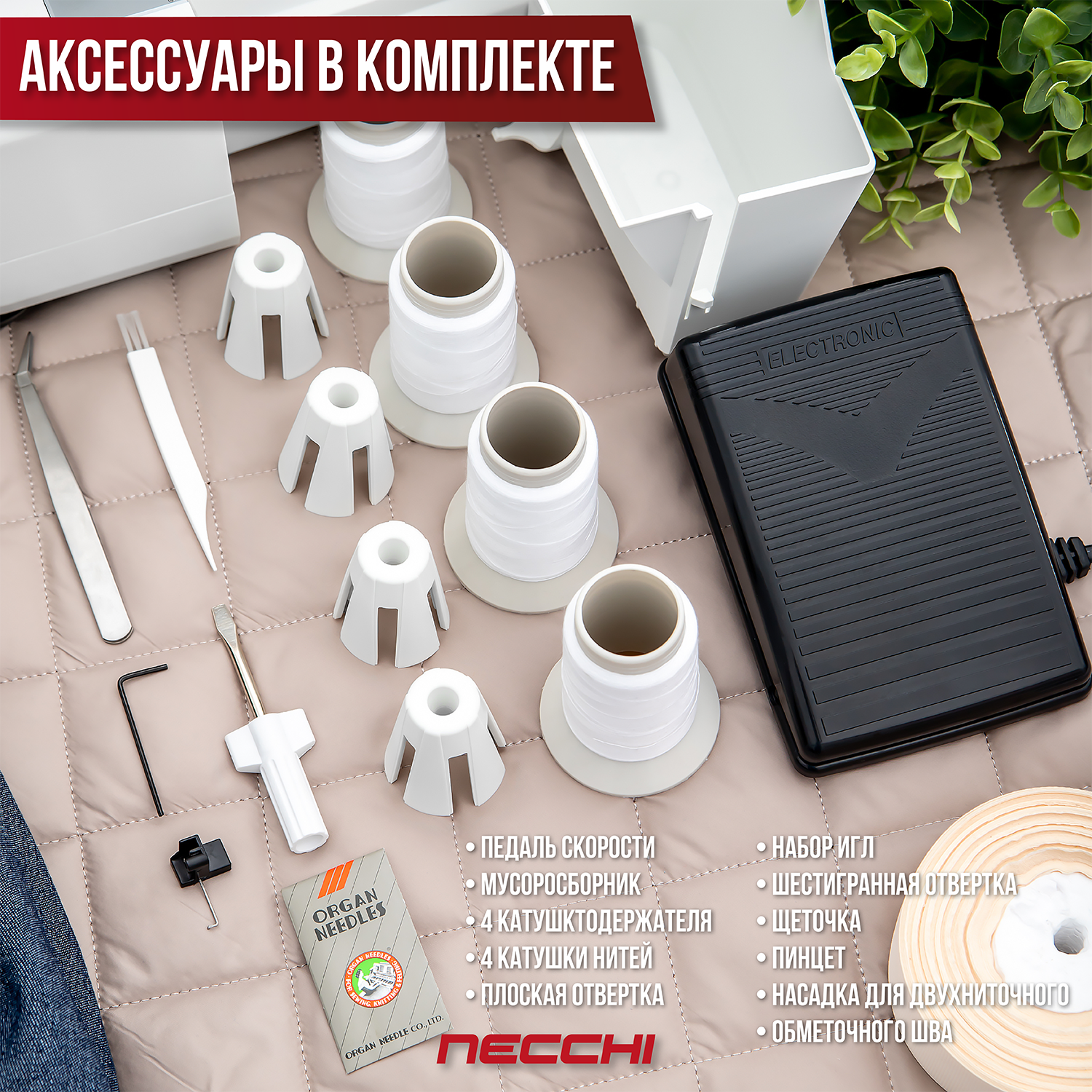 Оверлок Necchi 5600D, 2,3,4-х ниточный, съемная рукавная платформа, нитевдеватель, регулятор давления на лапку. интересное: