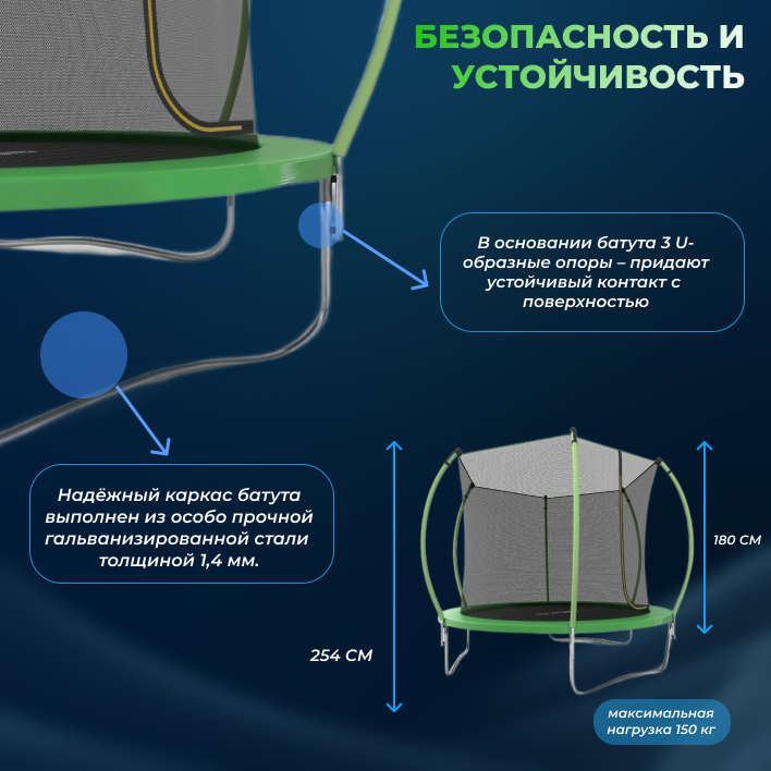 | Состав набора | каркас батута, прыжковое полотно, защитная сетка, инструкция |
