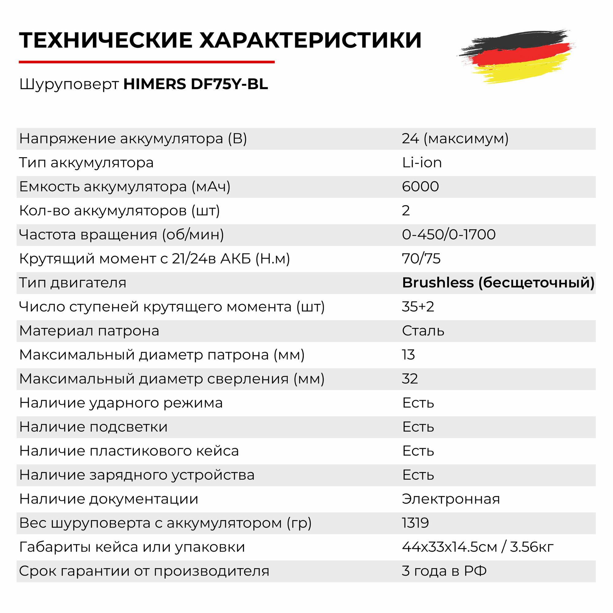 Купить Бесщеточный шуруповерт HIMERS DF75Y-BL аккумуляторный 24V, 2 АКБ по 6 А. ч, 75 Н. м, 13мм патрон, Кейс , ударный