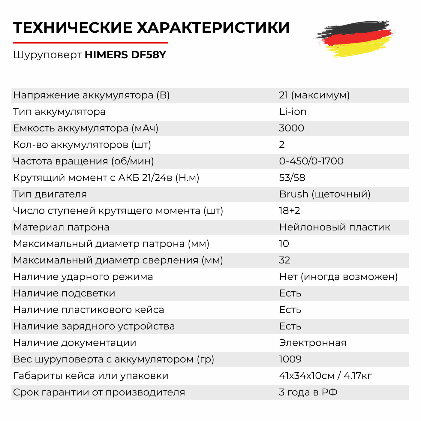Бесщеточный шуруповерт HIMERS DF60В-BL аккумуляторный 18V, 2 АКБ по 3 А. ч, 60 Н. м, кейс сталь
