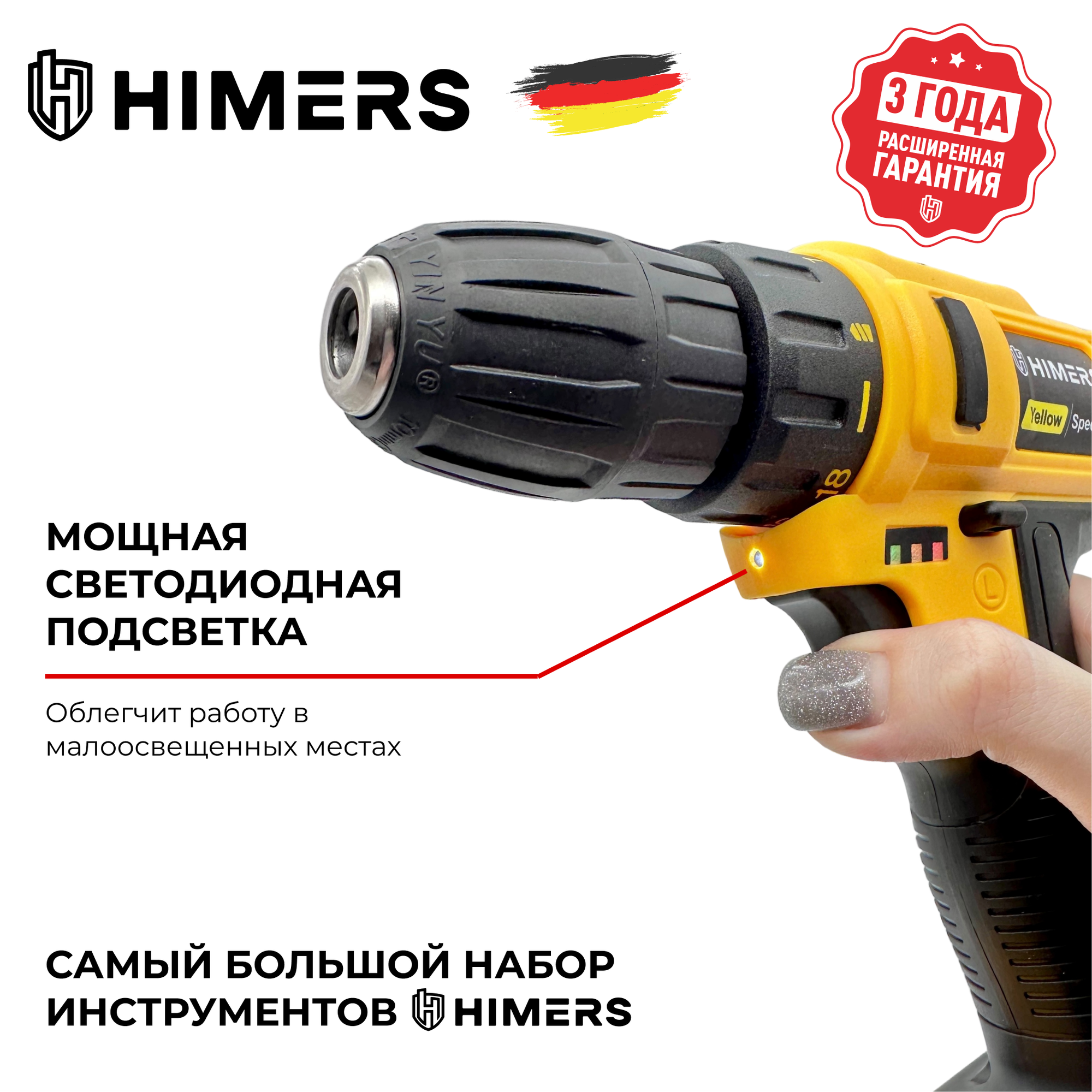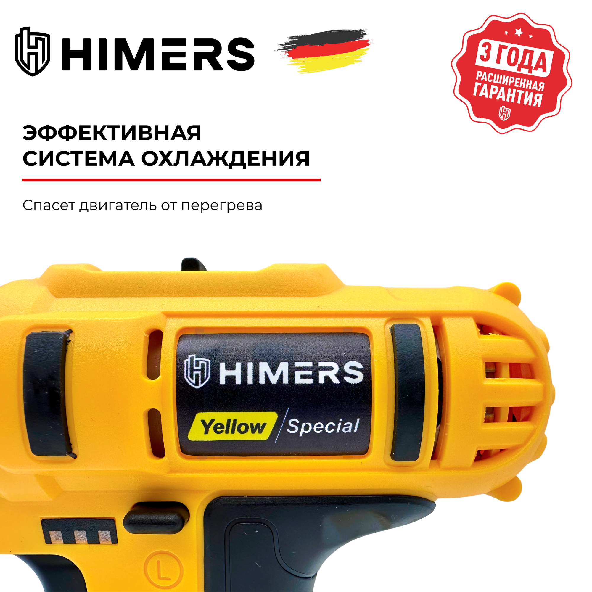 Бесщеточный шуруповерт HIMERS DF65Y-BL аккумуляторный 18V, 2 АКБ по 3 А.ч., 65 Н.м., 10мм патрон, Версия Yellow special / Кейс / многофункциональный для сверления, закручивания 18в