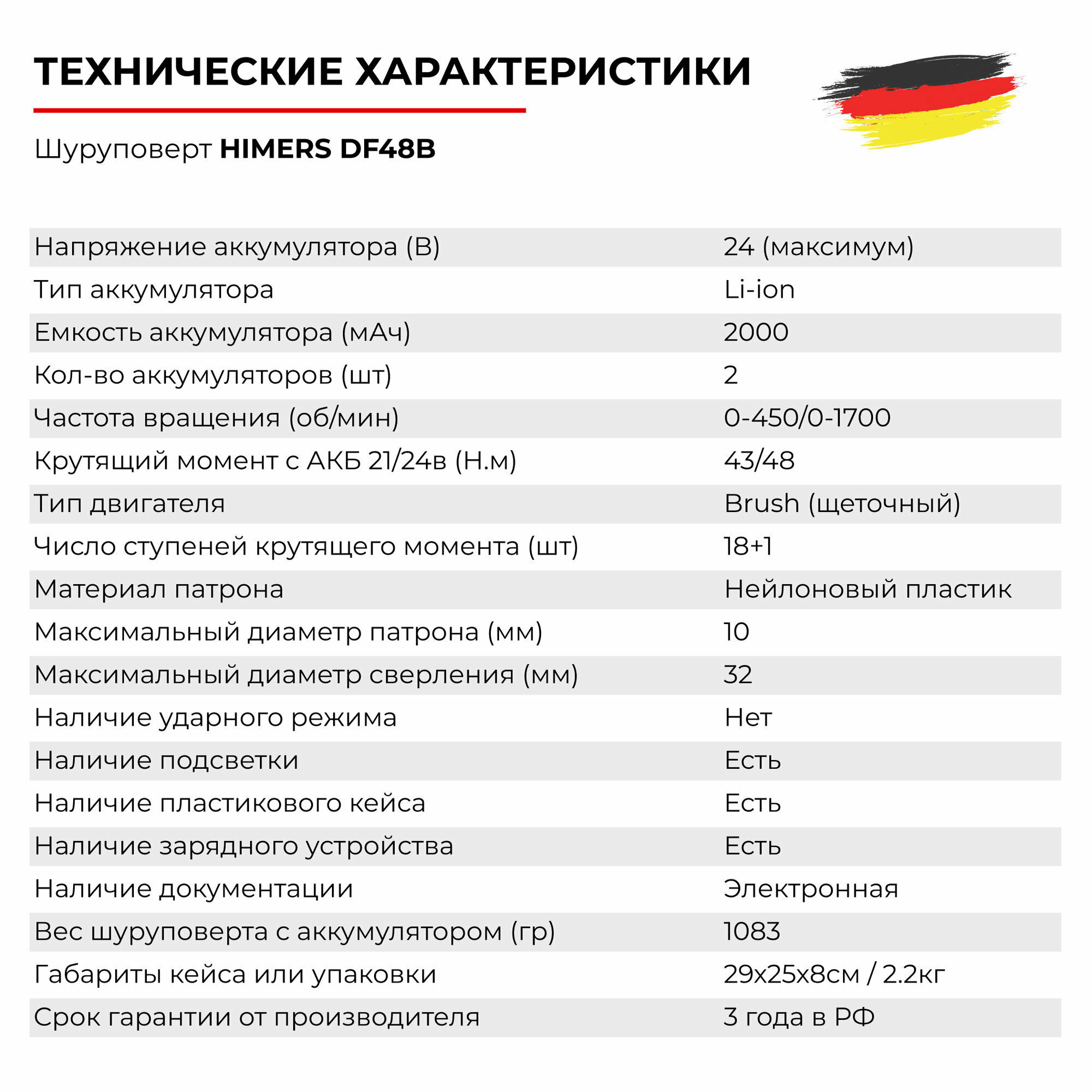 Дрель - шуруповерт HIMERS DF48B аккумуляторный 24V, 2 АКБ по 3 а.ч, 48 Н.м /, кейс