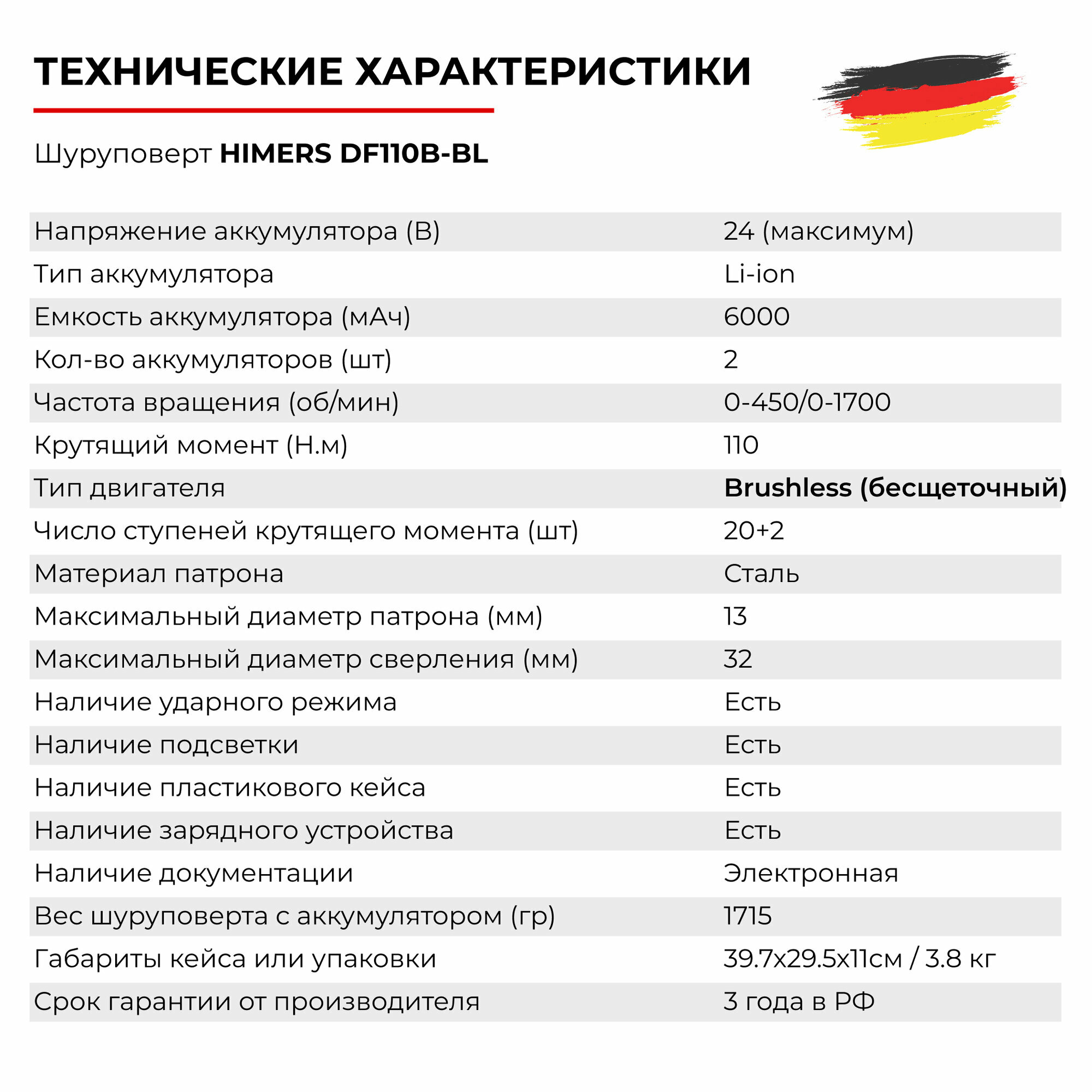 Ледоруб Бесщеточный шуруповерт HIMERS DF110B-BL MAX аккумуляторный 24V, 2 АКБ по 6 А.ч., 110 Н.м., Кейс / для сверления, закручивания 24в ледобур