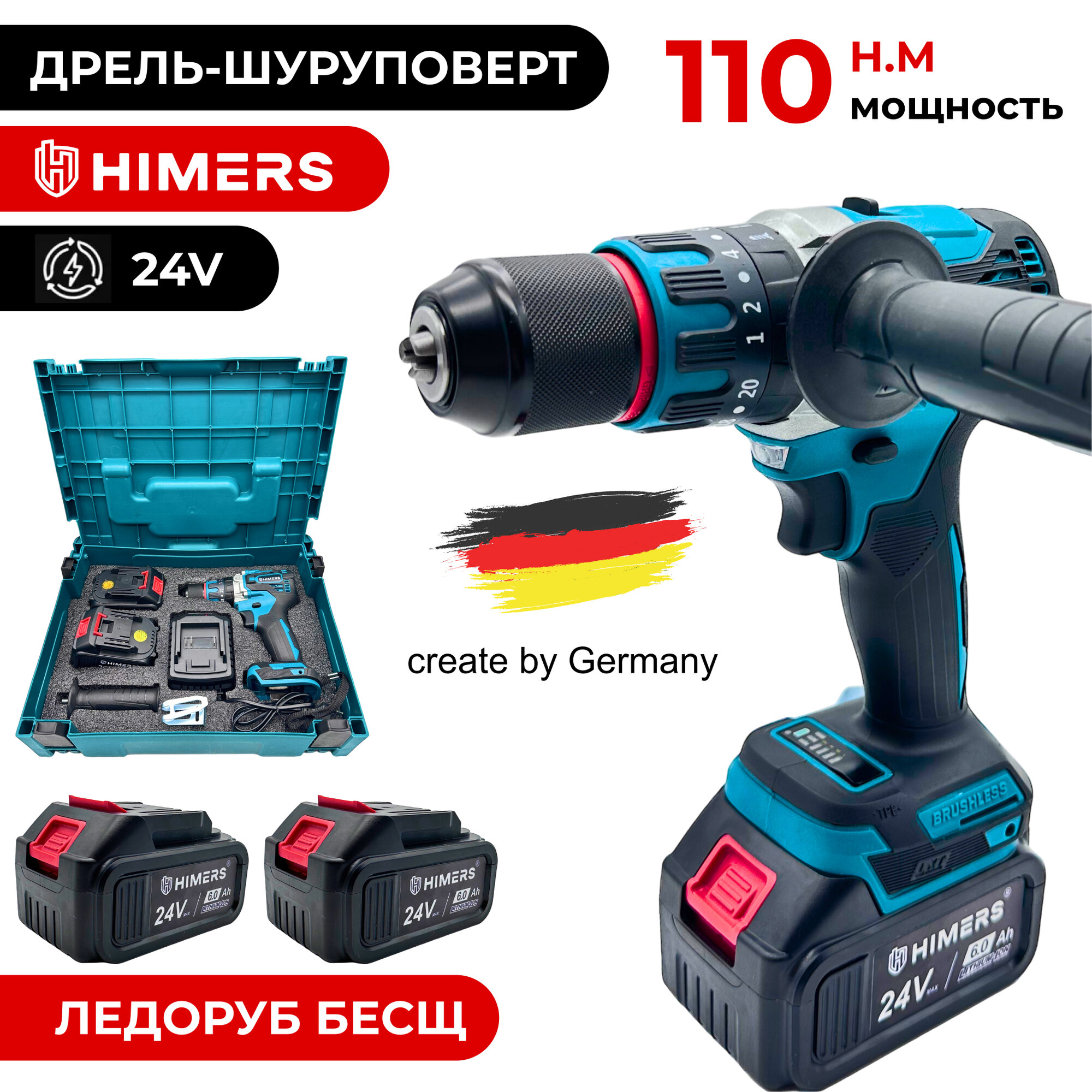 Ледоруб Бесщеточный шуруповерт HIMERS DF24BL MAX аккумуляторный 24V, 2 АКБ по 9 А.ч., 110 Н.м., Кейс / для сверления, закручивания 24в ледобур