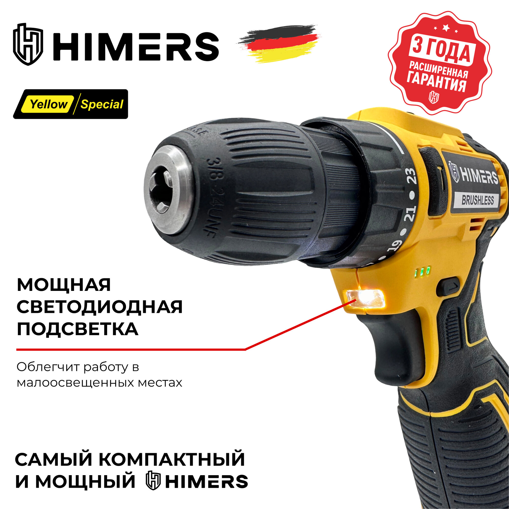 Бесщеточный шуруповерт HIMERS DF65Y-BL аккумуляторный 18V, 2 АКБ по 3 А.ч., 65 Н.м., 10мм патрон, Версия Yellow special / Кейс / многофункциональный для сверления, закручивания 18в