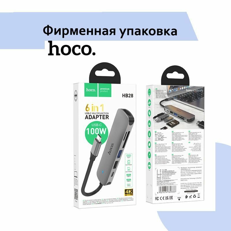 Купить Адаптер-переходник Hoco HB28, концентратор USB Type-C 100W, USB Хаб разветвитель 6в1(HDMI/USB/SD/TF/TYPE-C PD)