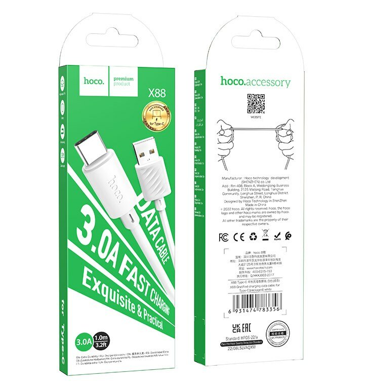 Купить Кабель Hoco X88, провод для андроид, быстрая зарядка для телефона, USB Type-C, белый, длина 1м