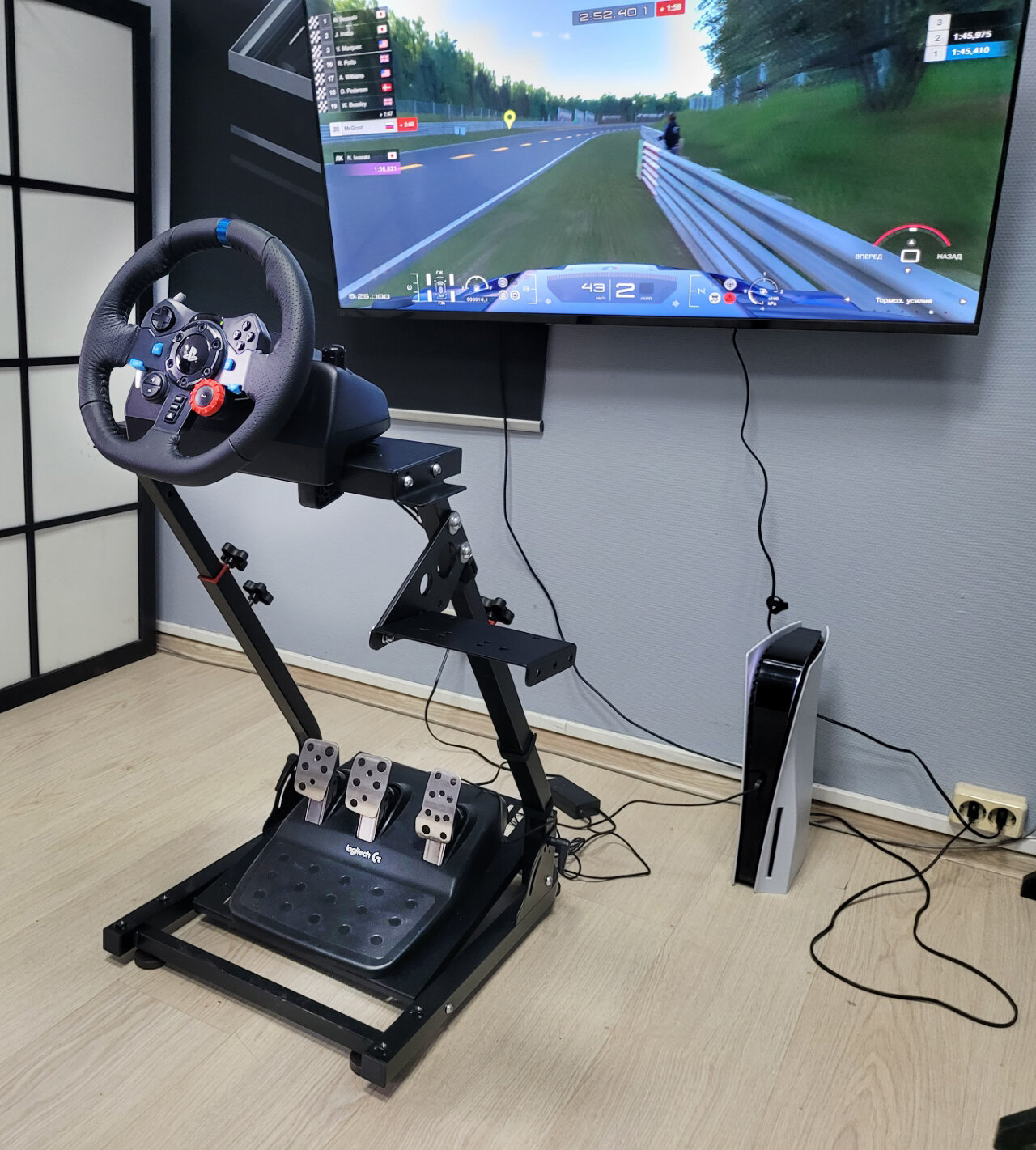 | Плюсы: | Не занимает много места. Есть возможность удобно расположить провода. Так же регулируется расположение педалей. |
