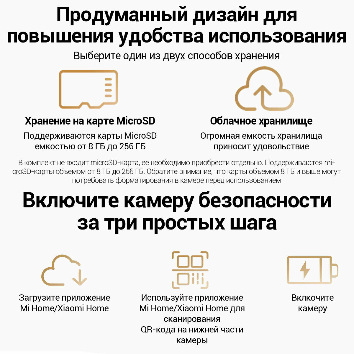 | Дополнительная информация | комплектация: IP-камера, кабель питания, комплект аксессуаров для настенного монтажа, руководство пользователя; три метода хранения: локальная карта Micro SD, устройства NAS и облако; карты памяти: MicroSD (до 256 Гб); слот для карты памяти: отдельный; управление со смартфона через приложение Mi Home; совместимые ОС: iOS 12, Android 8.0 и выше; апертура: F2.1; Wi-Fi (802.11): g, n, b |