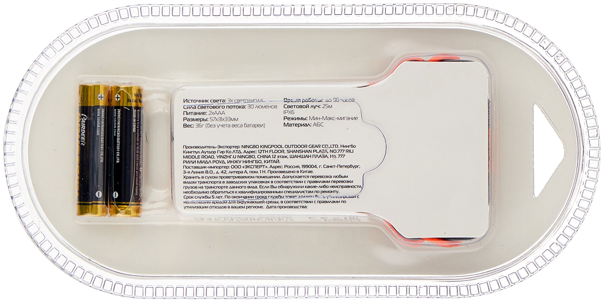| Дополнительная информация | тип батарей: AAA; количество батарей: 2; количество режимов работы: 3 |