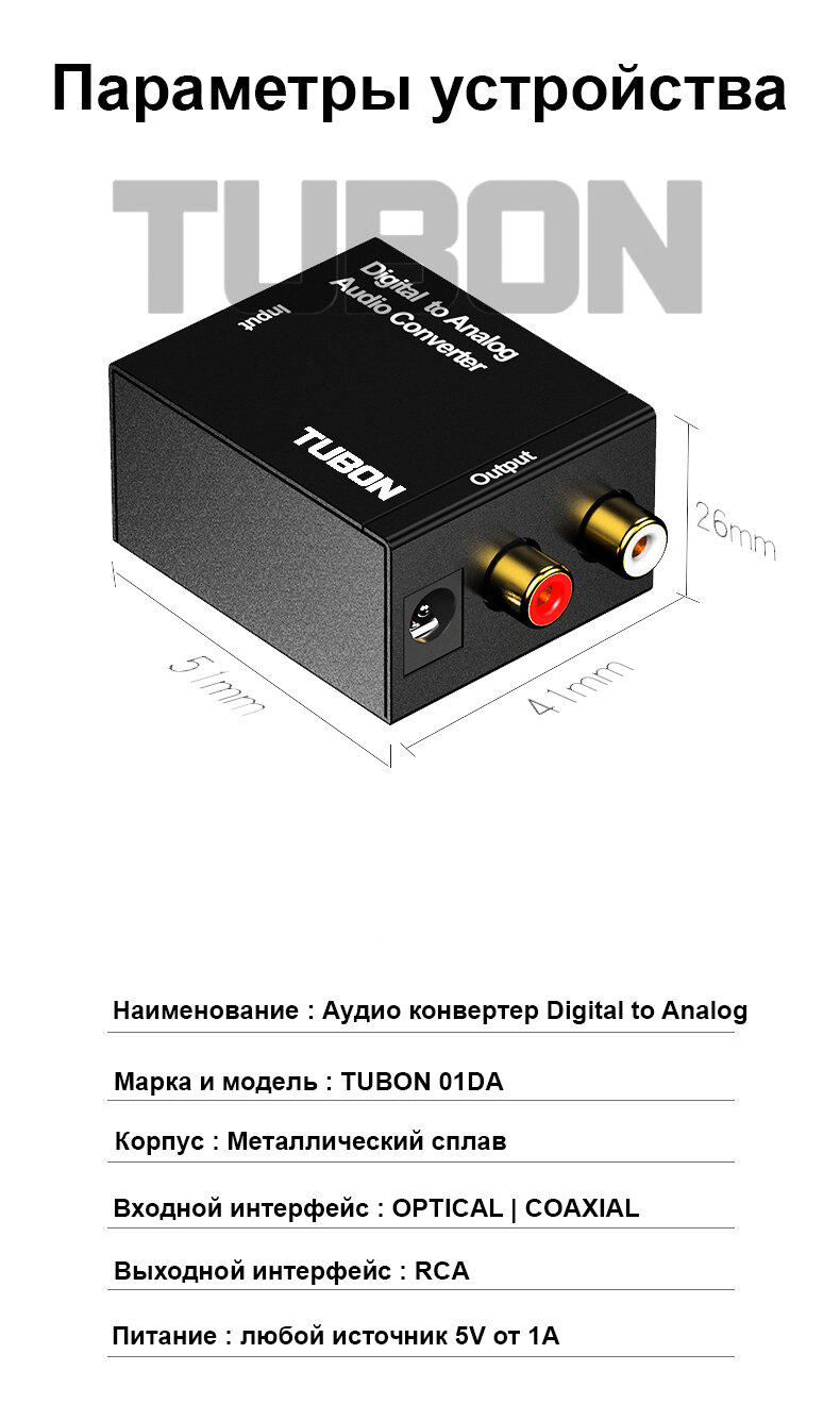 | Подробная комплектация | Переходник конвертер, Кабель Toslink/Optical, Кабель питания 5.5x2.5 на USB. |