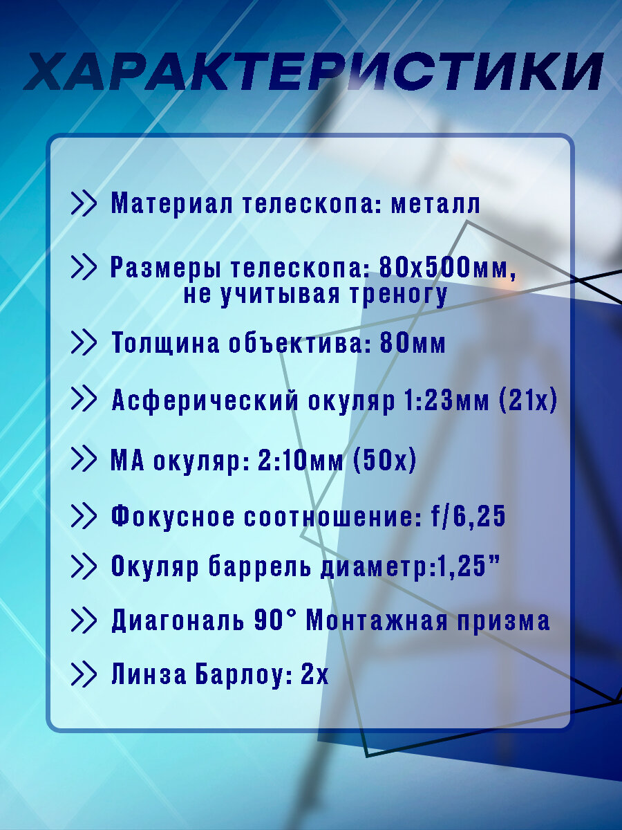 | Плюсы: | Хорошая комплектация. Удобные размеры для любителя-горожанина. В целом, добротно сделан. Где-то в обзорах писали, что здесь используется "нестандартный размер окуляров", но по факту вполне стандартный и ходовой 1,25". |