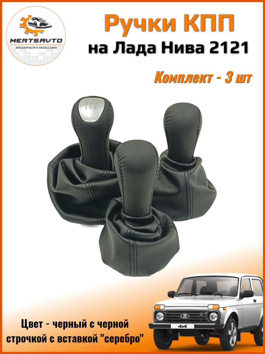 Набор ручек КПП Mertsavto , с чехлами, экокожа, чёрный с серой строчкой вставка серебро, Lada NIVA 4х4 /Urban /Legend