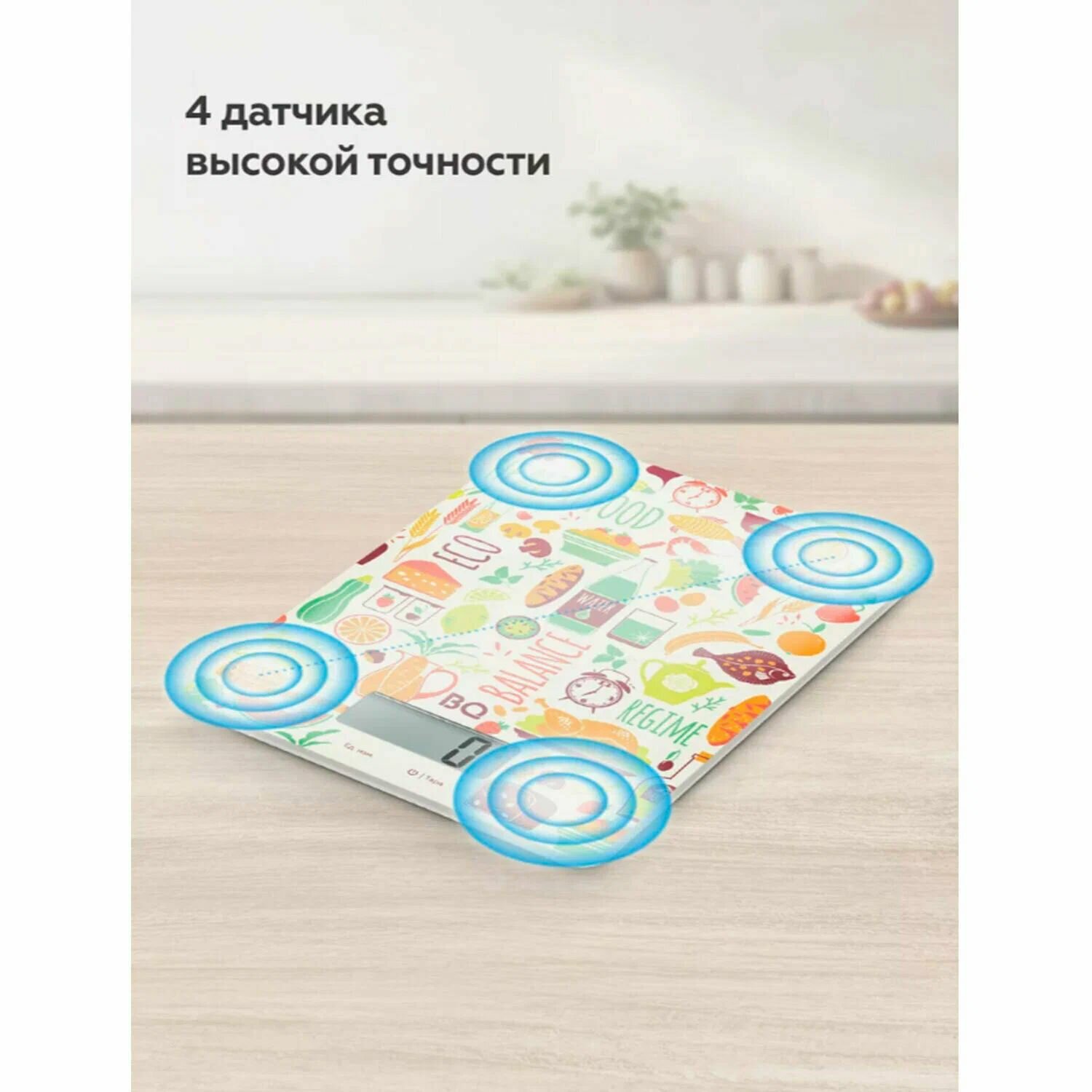 Весы кухонные BQ (БИ-КЬЮ) KS1010, электронный дисплей max вес 5кг, тарокомпенсация стекло с рисунком