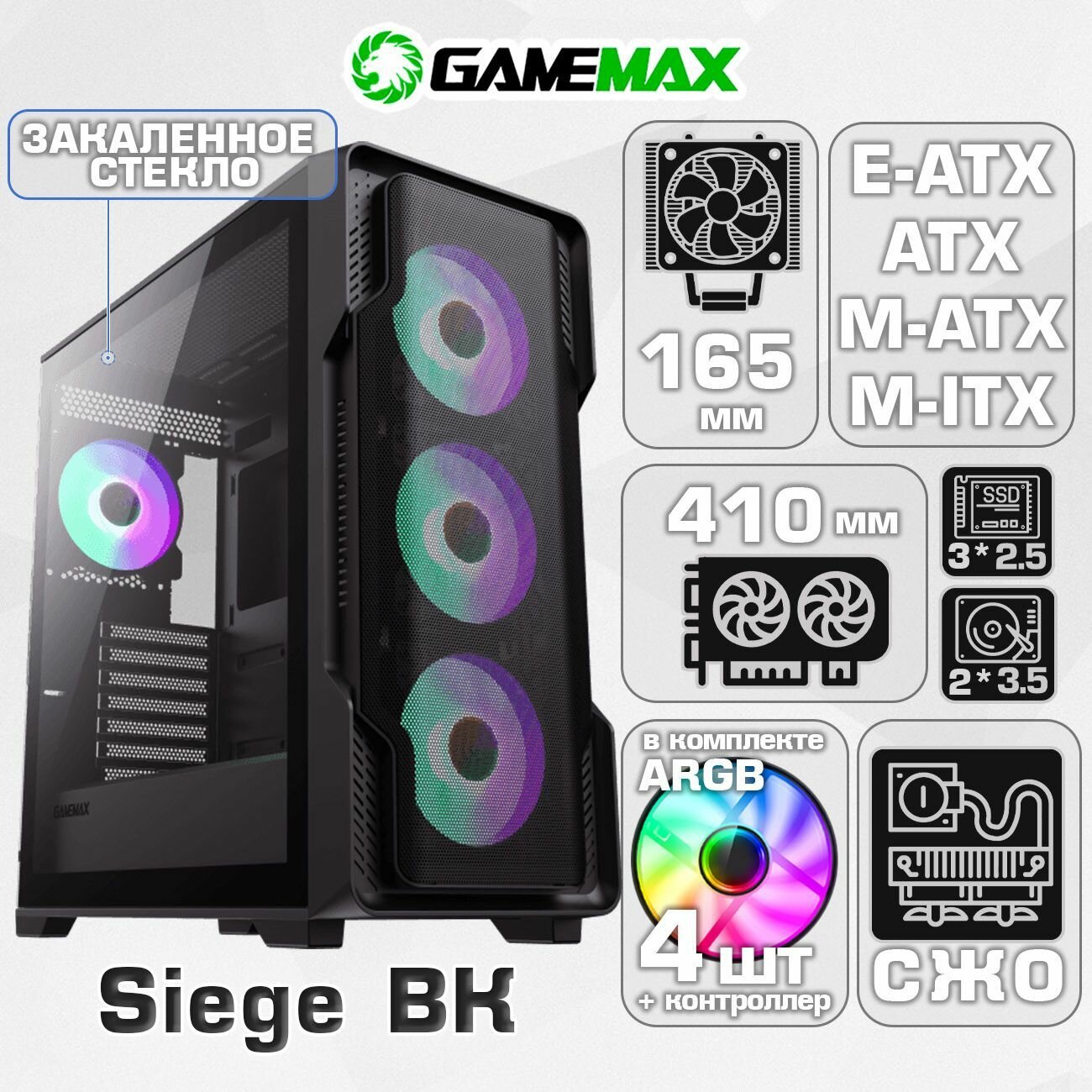 Купить Корпус GameMax SIEGE BK без БП (Черный Midi-Tower E-ATX, ATX, Micro-ATX, Mini-ITX CPU 165мм VGA 410мм Закаленное стекло, USB3.0, 4*120мм ARGB)