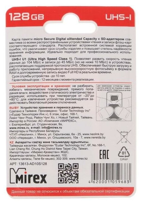 Ниже Вы можете прочитать отзывы на Mirex <13613-ad10s128> microSDXC 128Gb Uhs-i U1 Class10 + microSD-->SD Adapter ., ознакомится с подробными характеристиками, посмотреть интересные обзоры и фотографии на Mirex <13613-ad10s128> microSDXC 128Gb Uhs-i U1 Class10 + microSD-->SD Adapter ..