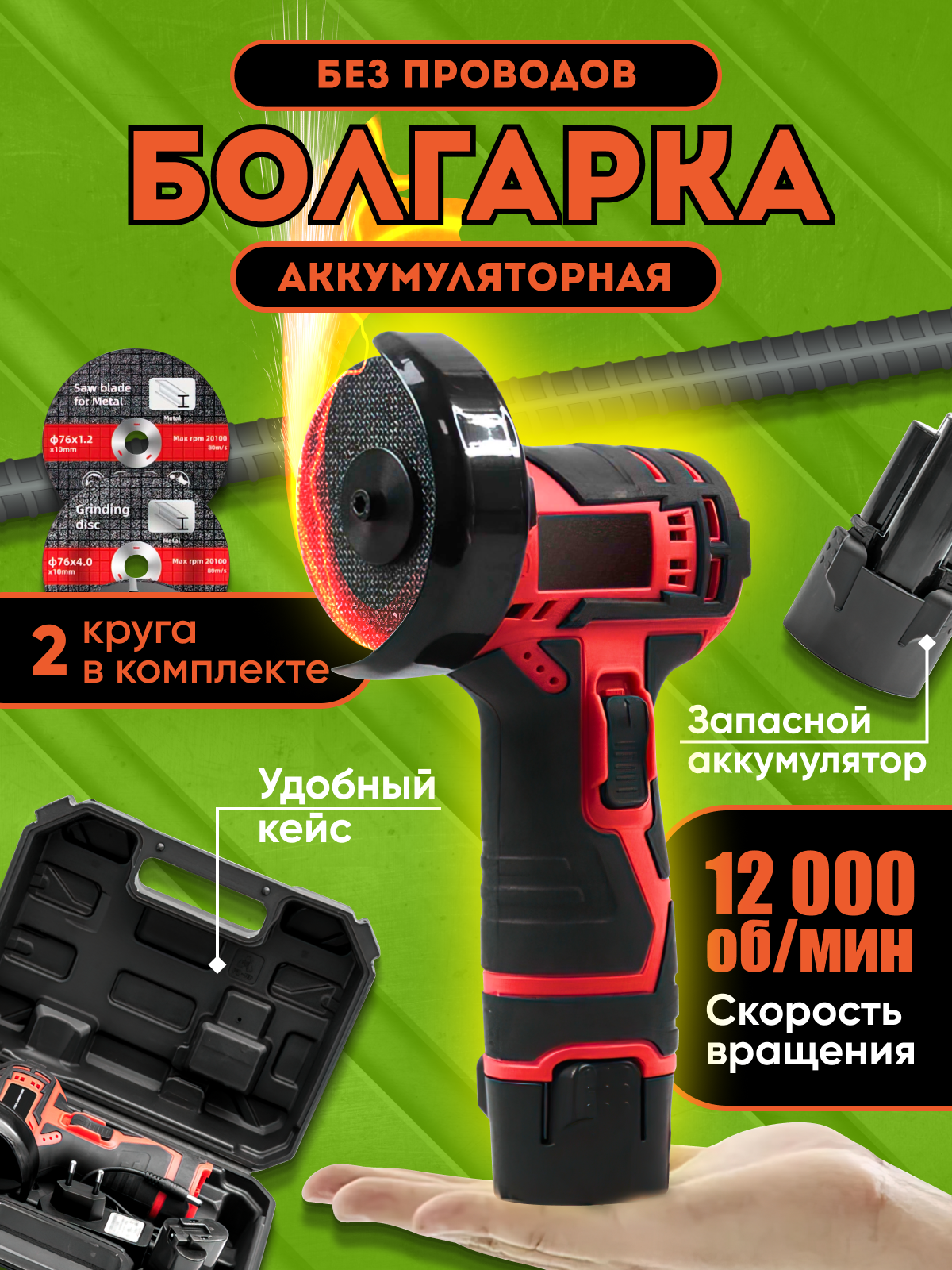 Болгарка аккумуляторная, мини ушм, 12В, 2000 мАч, плавный пуск