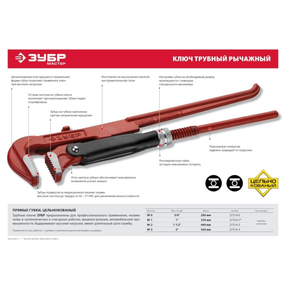 ЗУБР Ключ трубный ЗУБР "мастер" рычажный, прямые губки, цельнокованный, № 0, 3/4", ( 27314-0 )