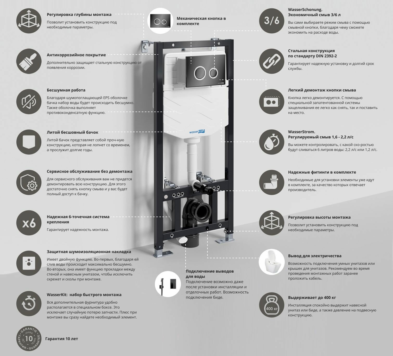 | Комплектация | звукоизоляция / кнопка смыва / рама / сливной бачок / WasserKit: набор быстрого монтажа / Выводы для воды (возможность подключения умных унитазов или крышек для унитазов) / Защитная шумоизоляционная накладка / Крепления для унитаза / Механическая кнопка смыва (черная глянцевая) / Фитинги для подачи и слива воды |
