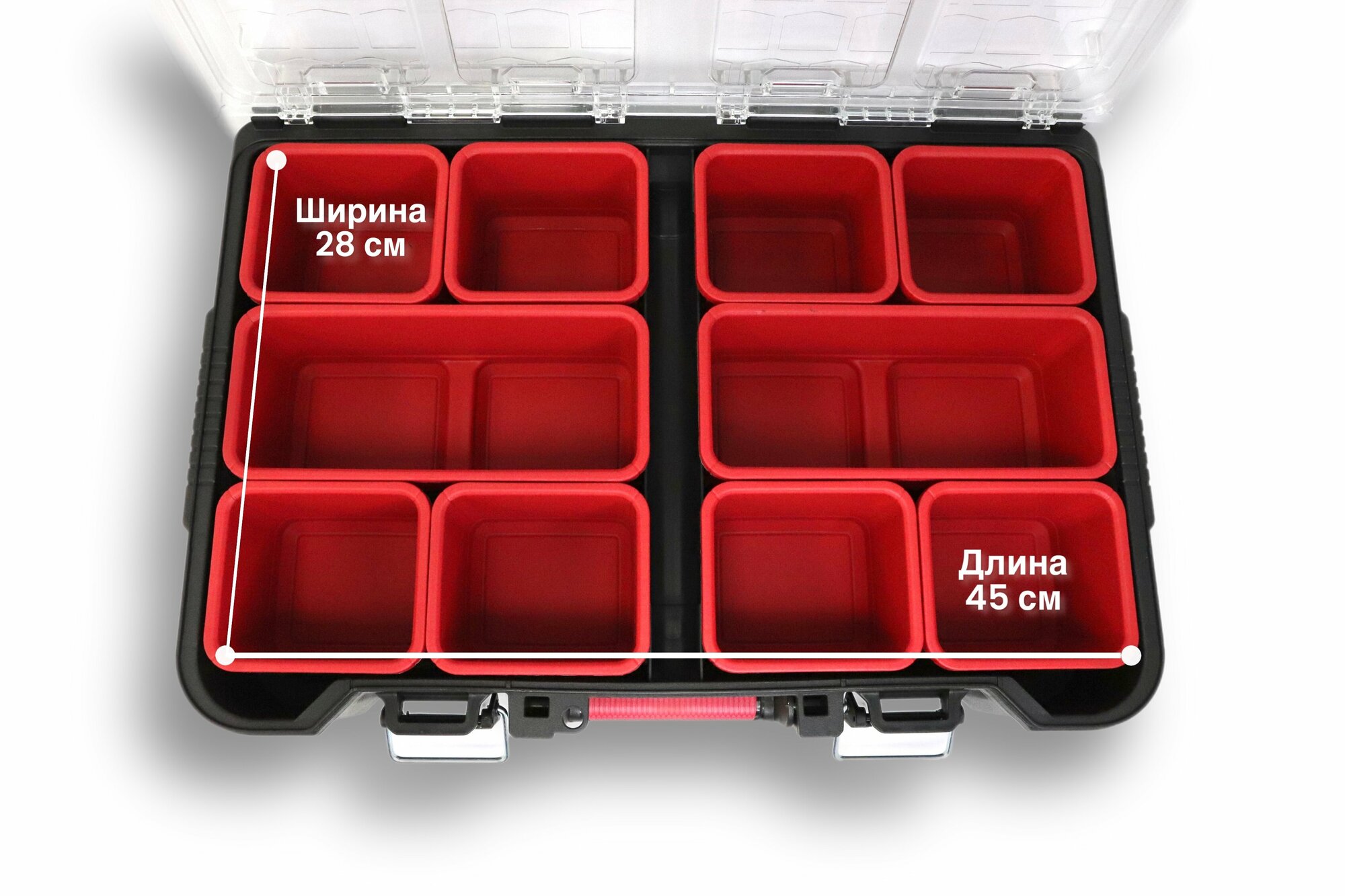 | Дополнительная информация | надежная прочная конструкция, съемные лотки, складная ручка для переноски, прозрачная крышка, усиленные стенки и дно, металлические защёлки |