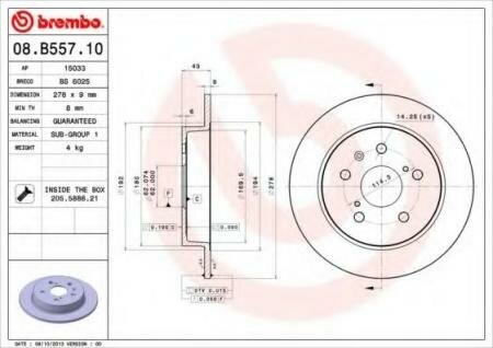 BREMBO 08.b557.10 (08B55710 / 0986479047 / 15033) диск тормозной задн. Suzuki (Сузуки) sx4 (ey gy) 06 / 06- (Комплект 2 штуки)