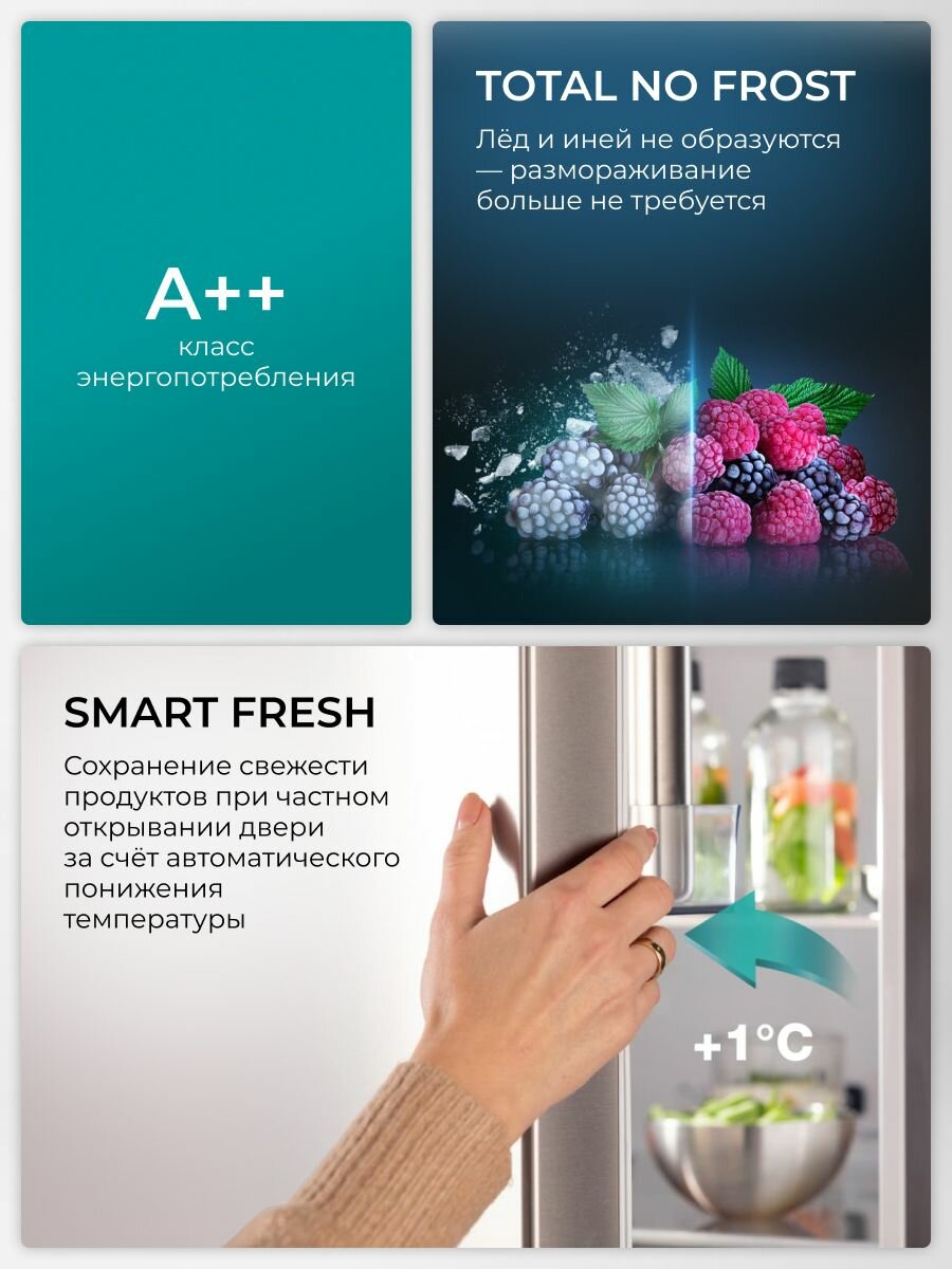 | Отзыв: | Имеется огромный ящик во всю глубину холодильника для овощей и фруктов, с оптимальной температурой хранения и влажностью, позволяющей сохранить свежесть продуктов, отлично работает эта функция. Морозильник огромный, во весь рост, слева, ящики удобно выдвигать. Рекомендую, отличное решение для большой семьи, не шумит, не надо размораживать. |