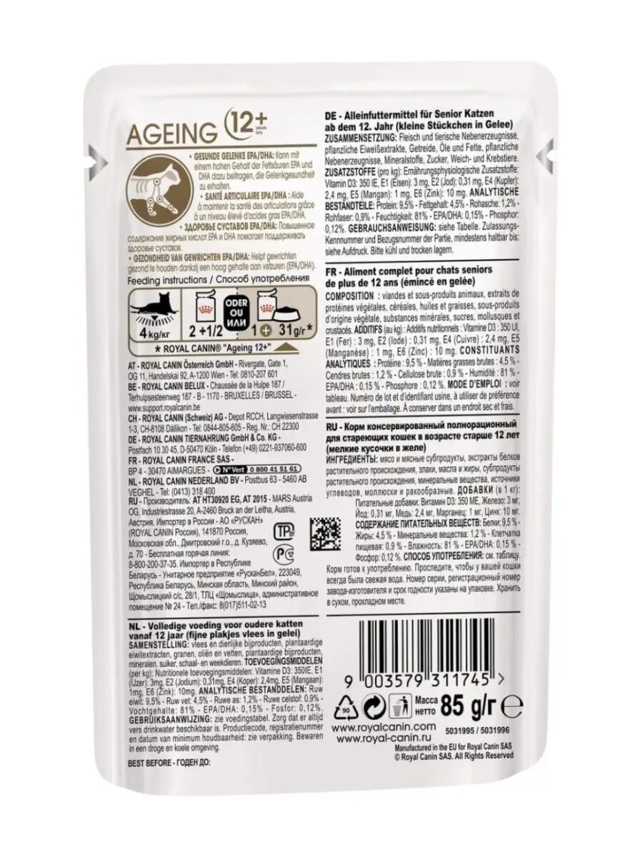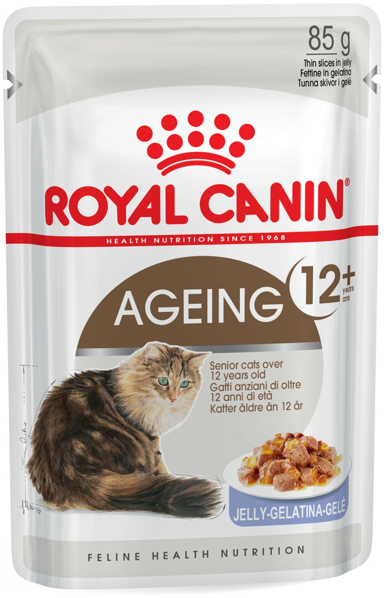Купить Влажный корм для пожилых кошек Royal Canin Ageing +12 для здоровья костей и суставов, профилактика избыточного веса, 28 шт х 85 г (кусочки в желе)