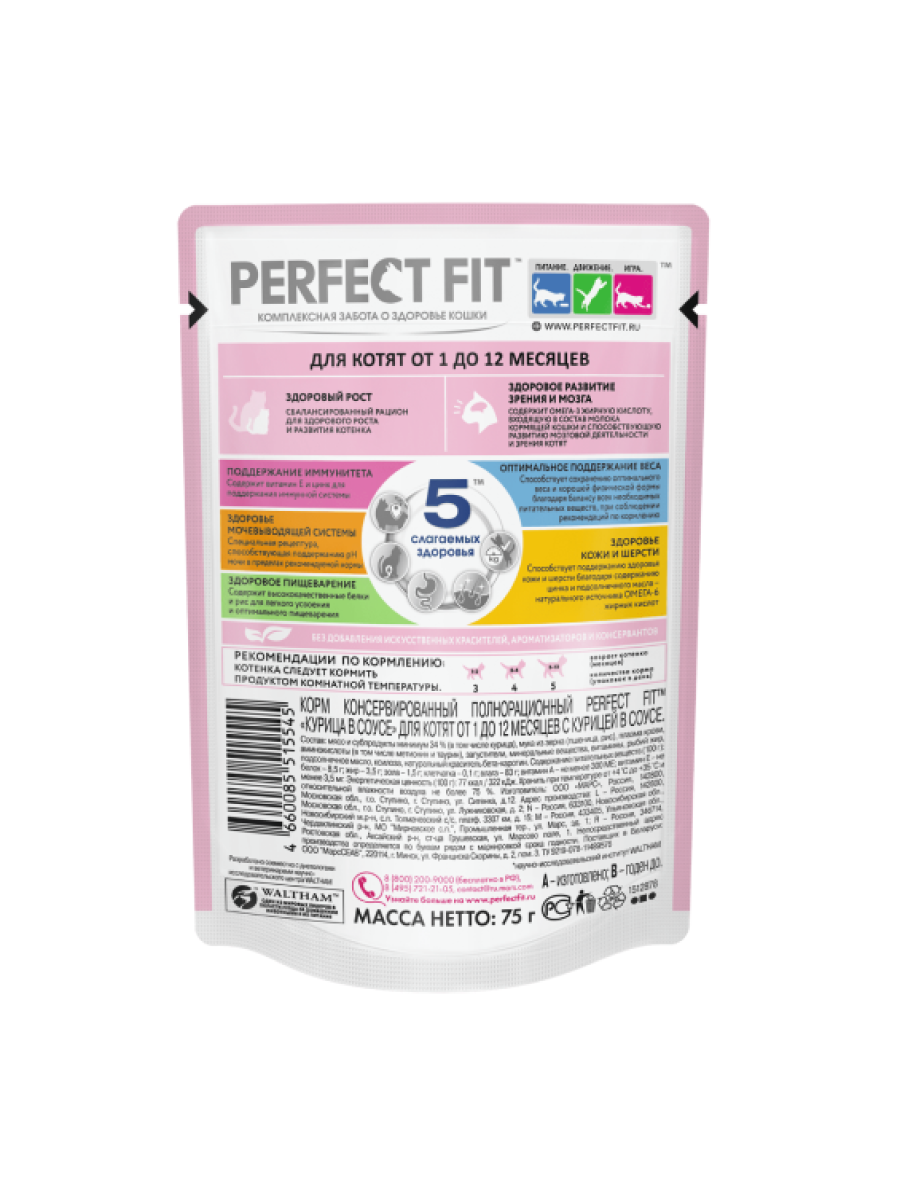 Влажный корм для котят PERFECT FIT от 1 до 12 месяцев с курицей в соусе, 75 г, 28 шт