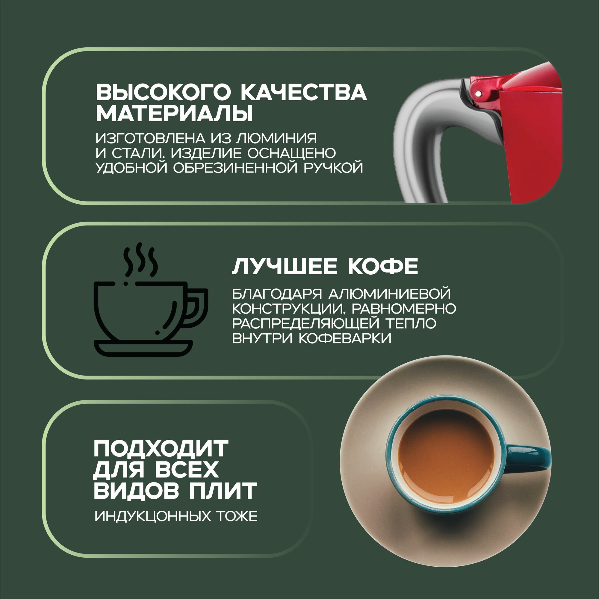 | Плюсы: | Удобная кофеварка, подходит под индукцию. Легко чистится. Оптимальный размер для заварки утреннего кофе |