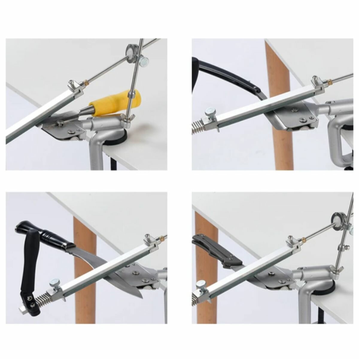 Фиксируется столу, при заточке легко можно лезвие поменять сторонами, можно выполнить заточку на одно сторону по все длине лезвия.
