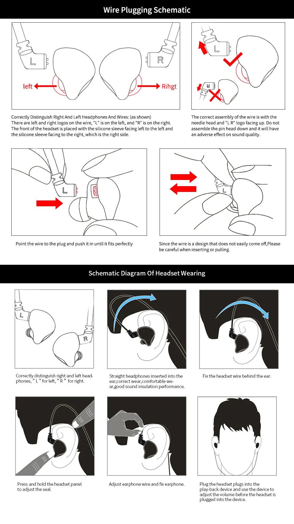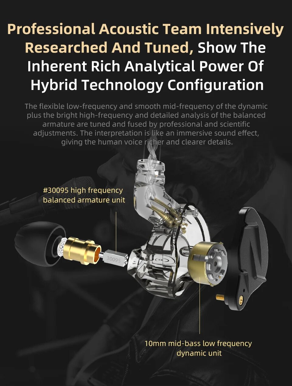 Немного большеваты из-за тех же амбюшур с эффектом памяти, но после непродолжительного времени их уже не заметно. Провод заводится за ушами, но думаю и к этому привыкнуть можно, учитывая что это дополнительная опора и весь KZ с таким принципом ношения. |