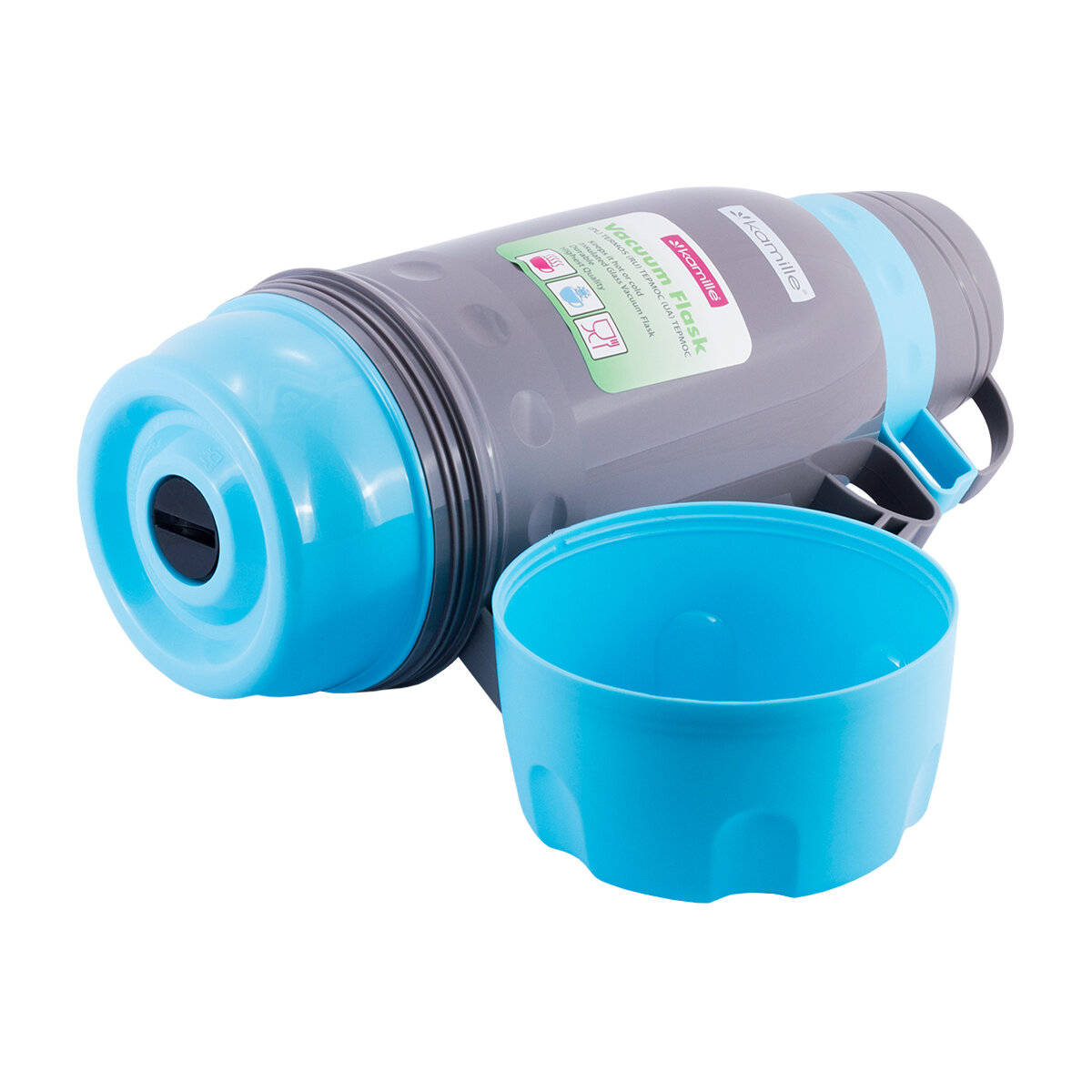 Термос 1800 мл. пластиковый со стеклянной колбой Kamille KM-2081 (2 чашки) (голубой) интересное: