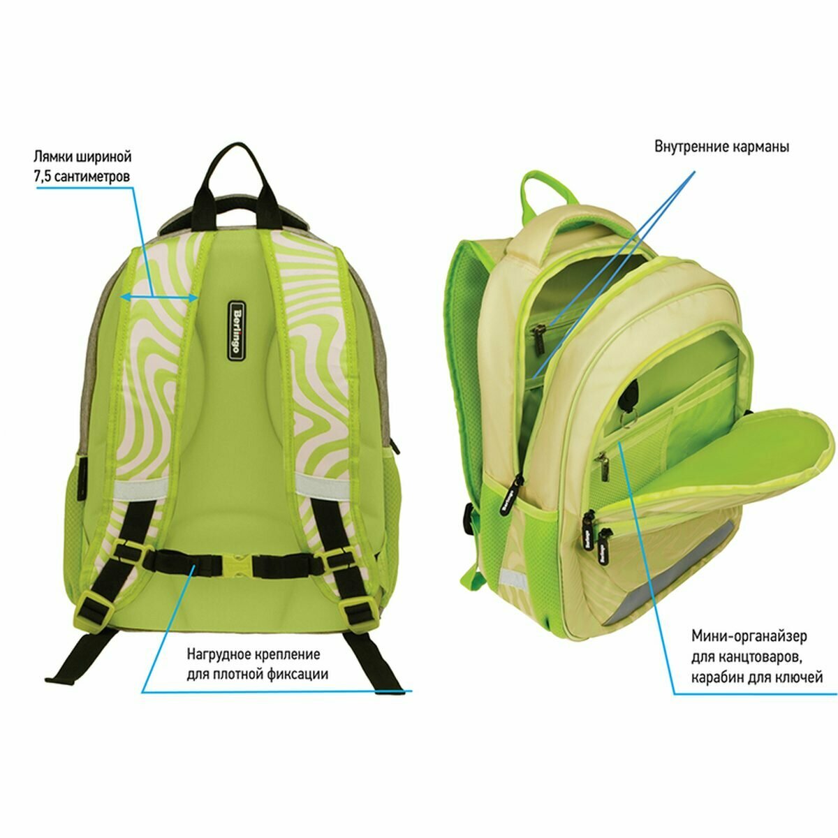 | Особенности | без наполнения / вентилируемая спинка / грудная стяжка / карабин для ключей / ортопедический / регулируемые лямки / ручка для переноски / светоотражающие элементы / эргономичная спинка |