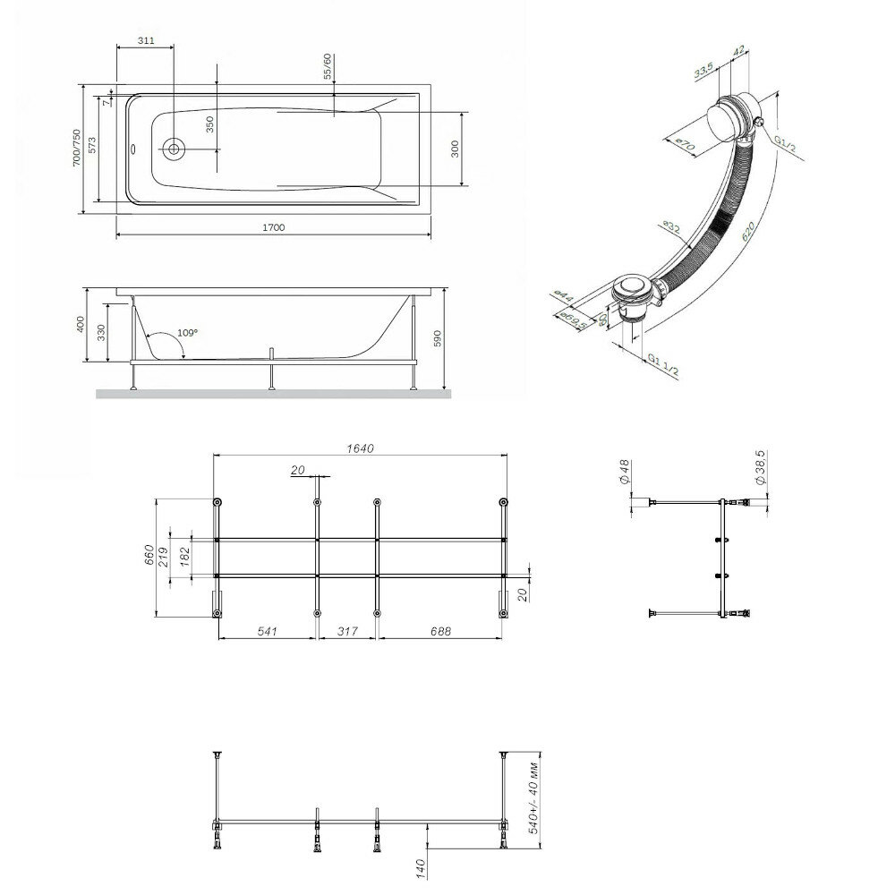 | Подробная комплектация | ванна, каркас, слив-перелив |