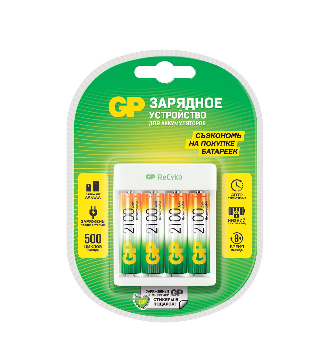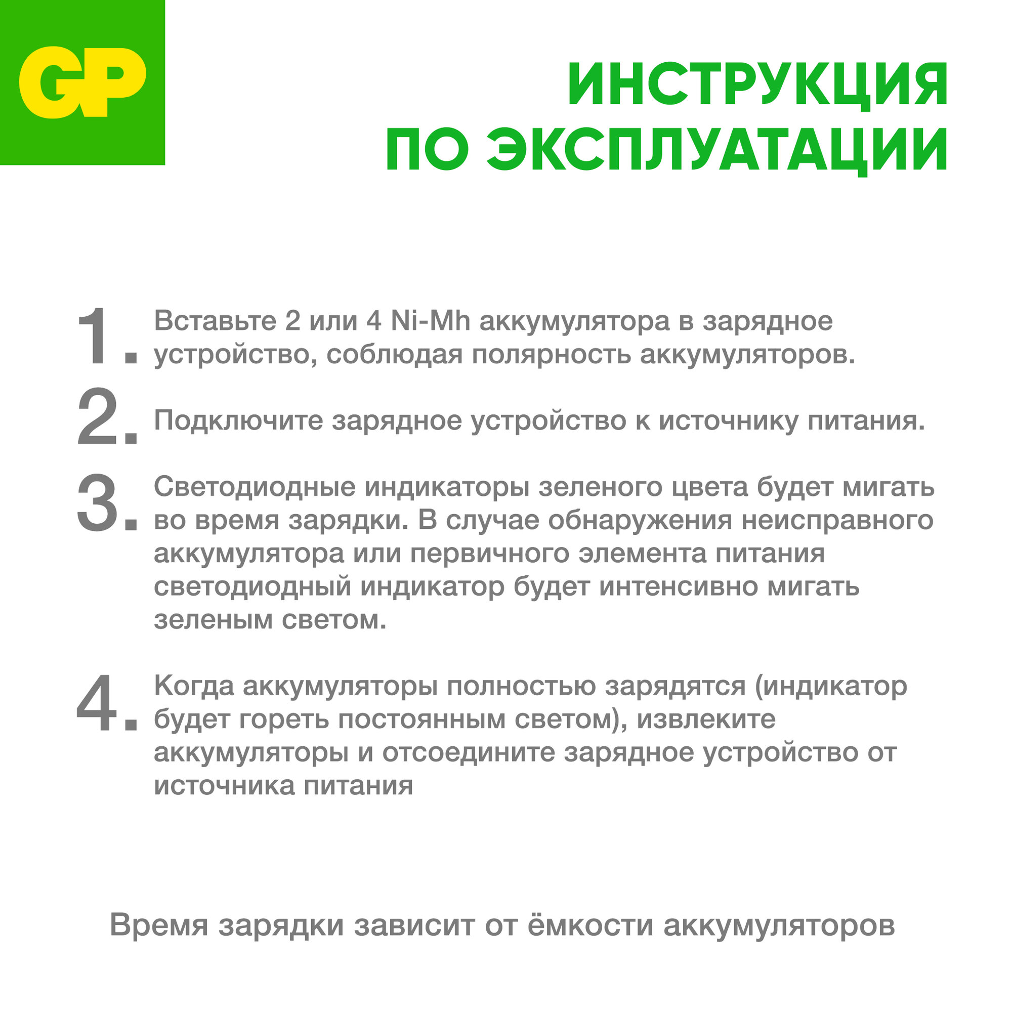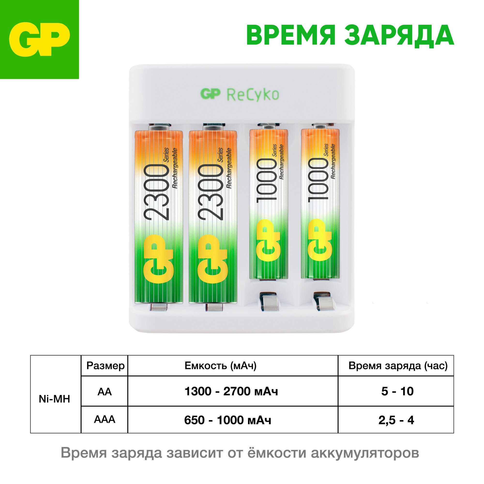 Зарядное устройство GP для аккумуляторных батареек АА и ААА, на 4 слота, с аккумуляторами 2100 mAh, набор 4 шт, с кабелем micro USB интересное: