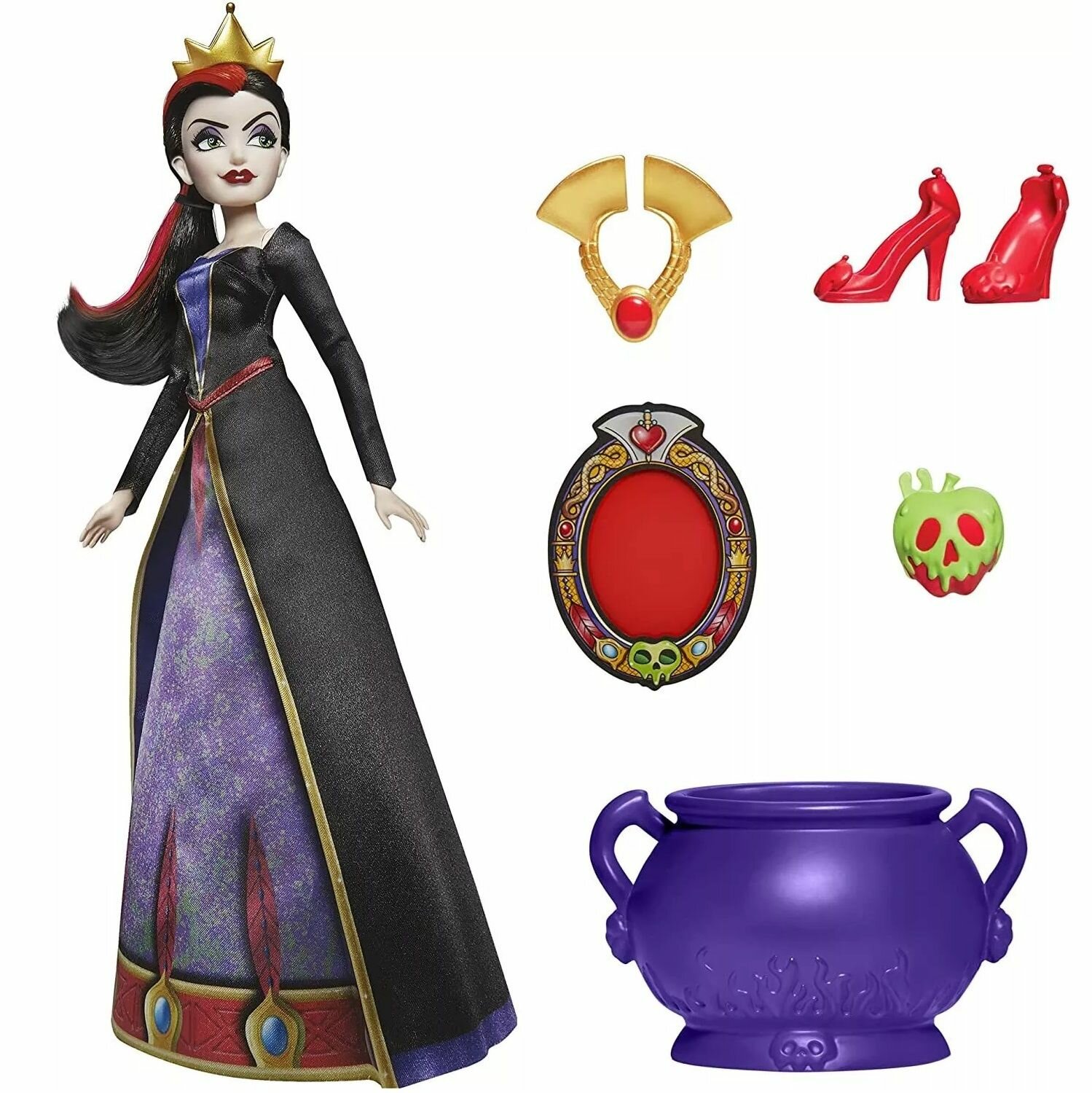| Комплектация | кукла, платье, пара туфель, ожерелье, корона, котел, ядовитое яблоко, декодер |