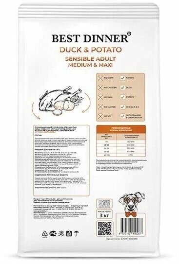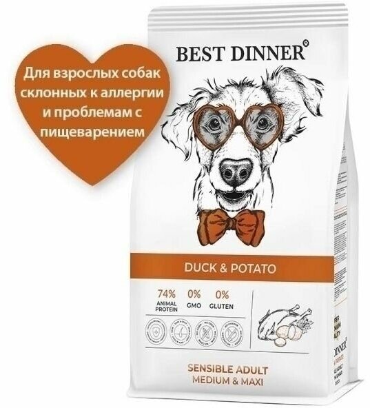 BEST DINNER 3кг корм сухой для собак Adult sensible Medium&Maxi склонные к аллерг. и чувствит. пищевар. утка с картошкой